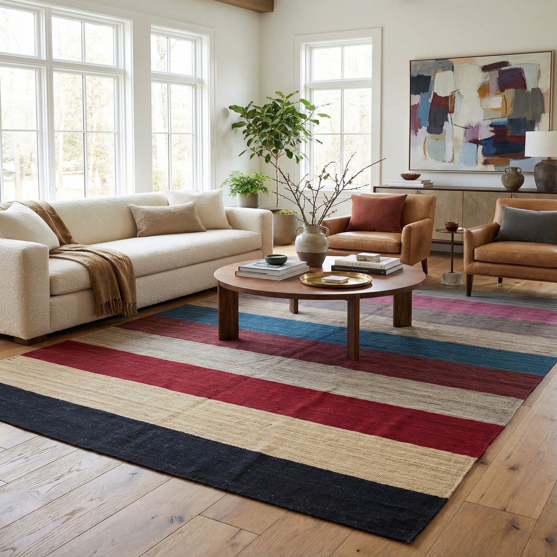Part of the Kilim Modern collection, this hand-woven rug measuring 6x9 showcases a timeless design that effortlessly enriches any space. Its pattern is an array of bold, horizontal stripes that create a striking visual landscape. Crafted with 100% wool, the rug's texture presents a flat weave that's tactile yet durable.