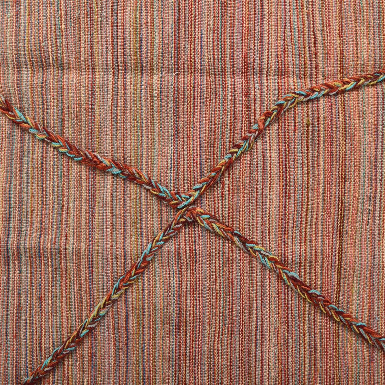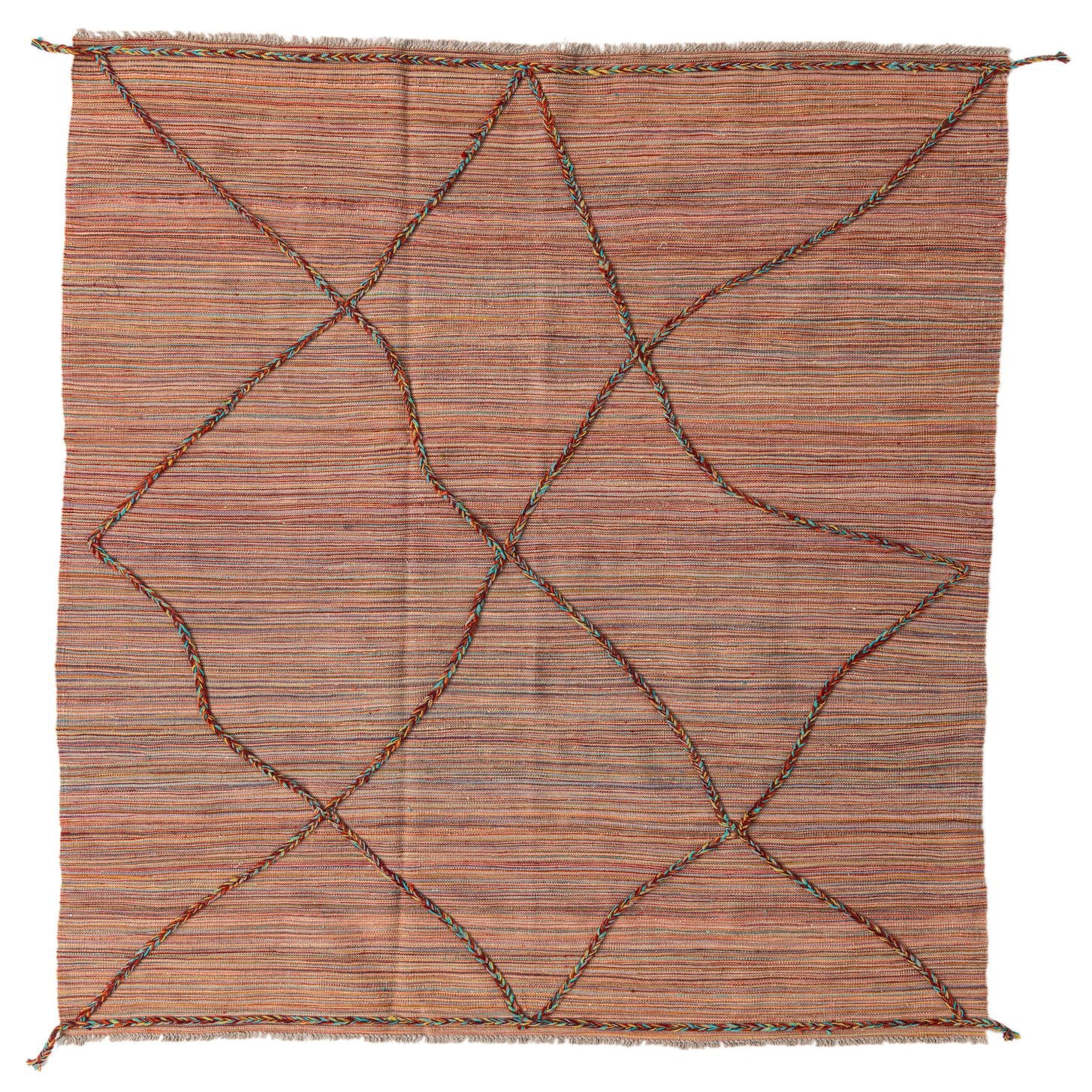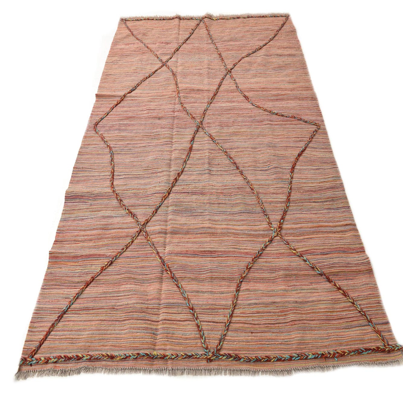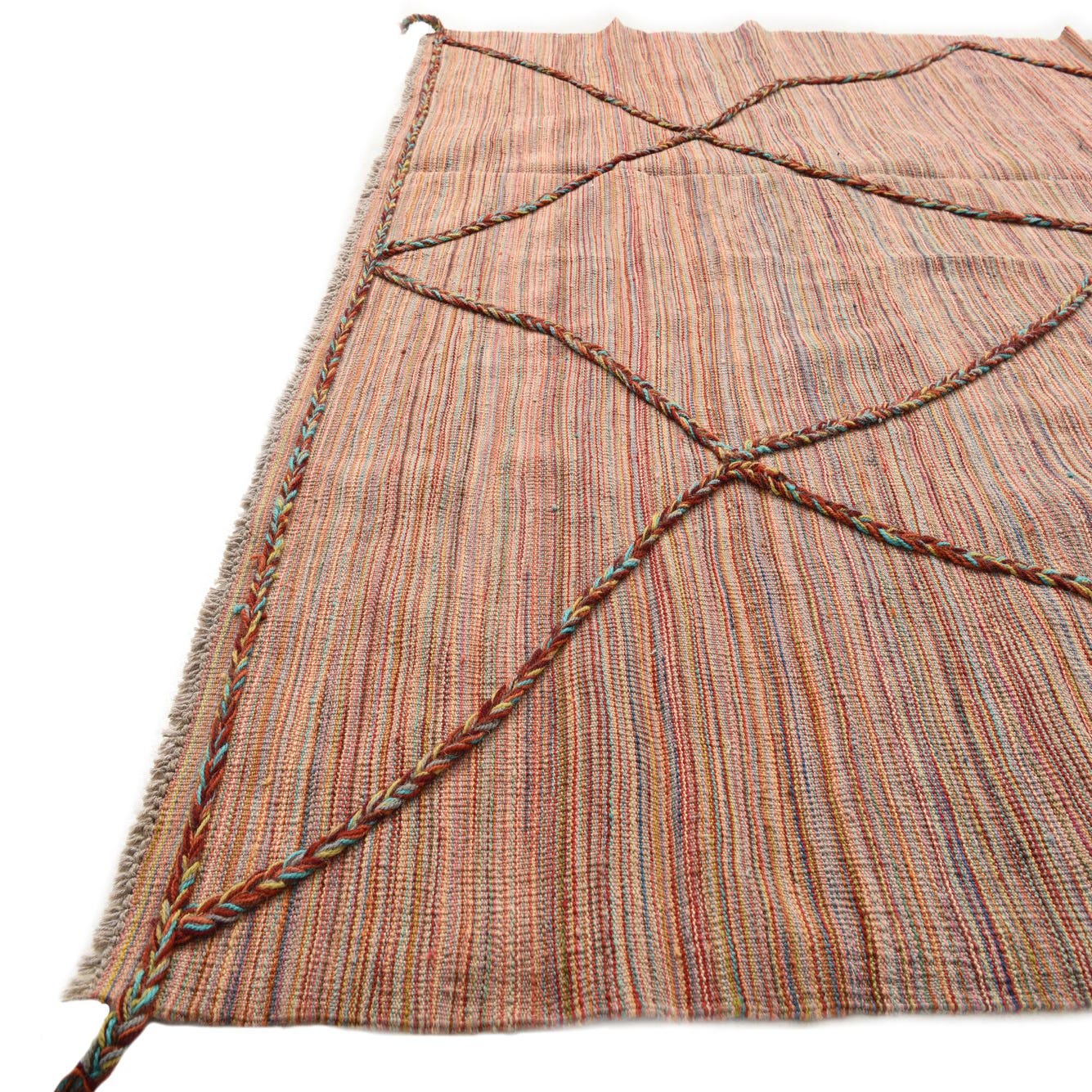 A 6x9 rectangular multi-colored flatweave wool rug with a tribal geometric pattern of braided lines.