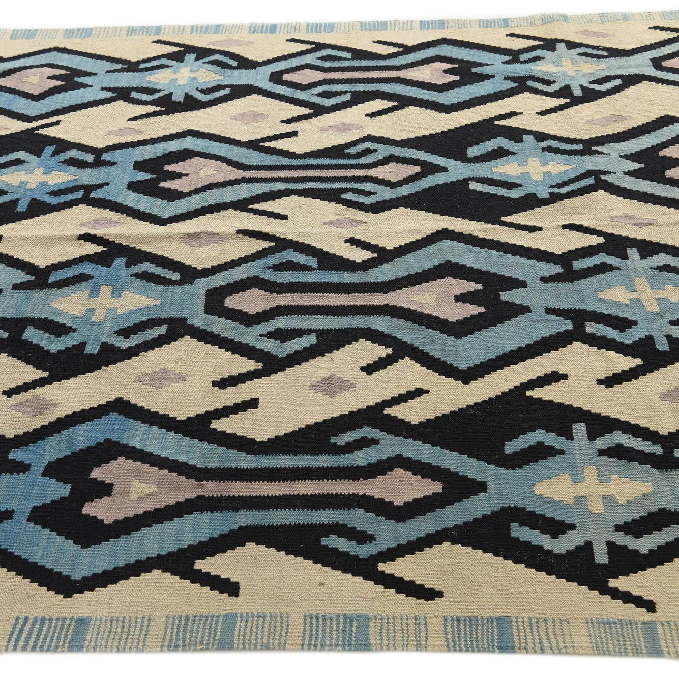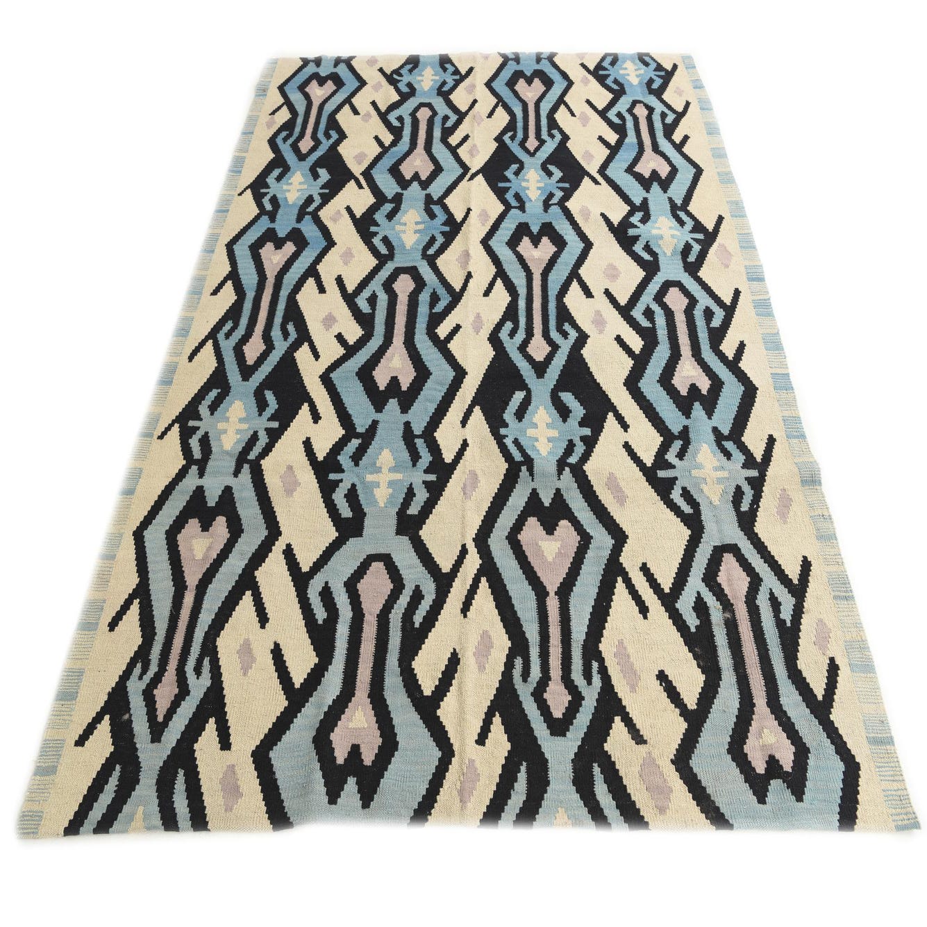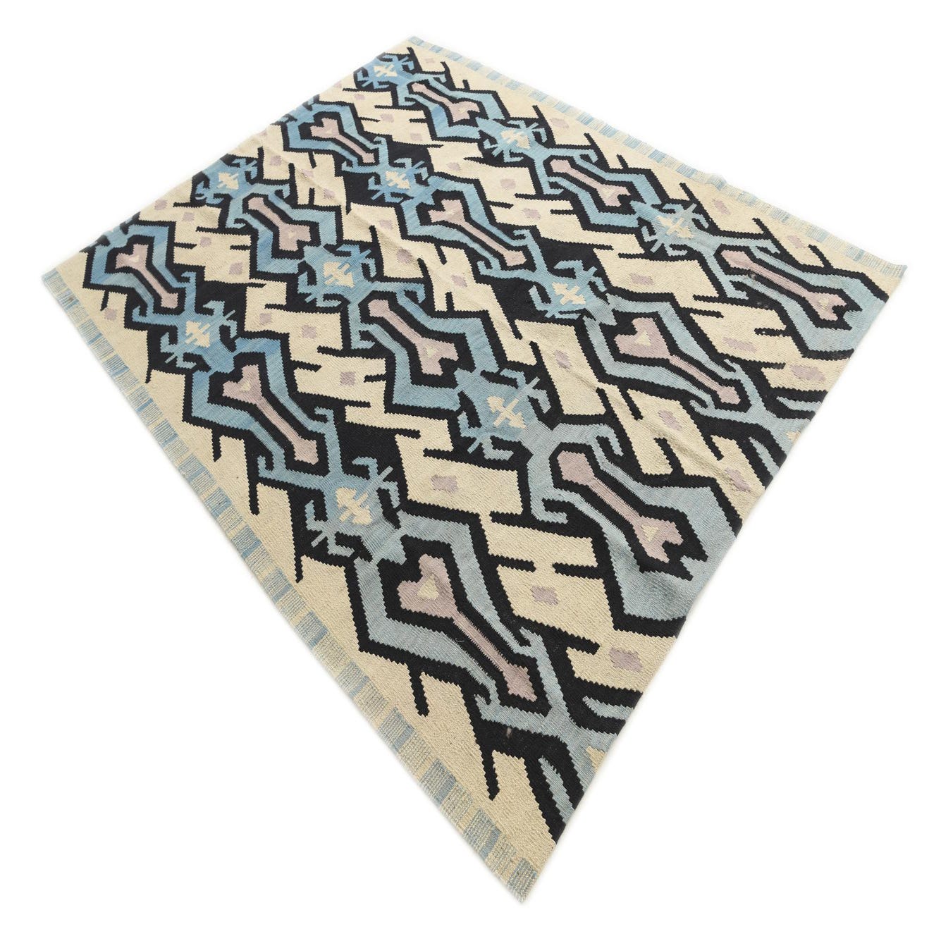 A 6x9 rectangular Kilim Modern rug with a multi-colored tribal pattern in blues, black, and cream.