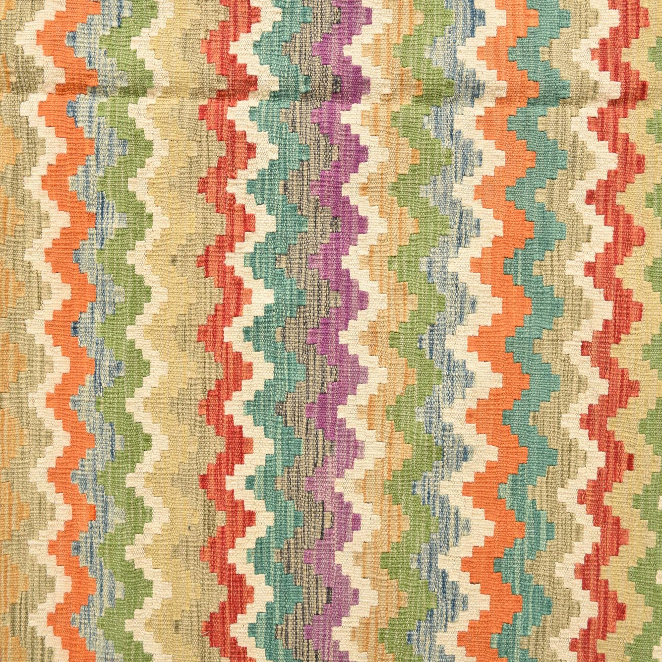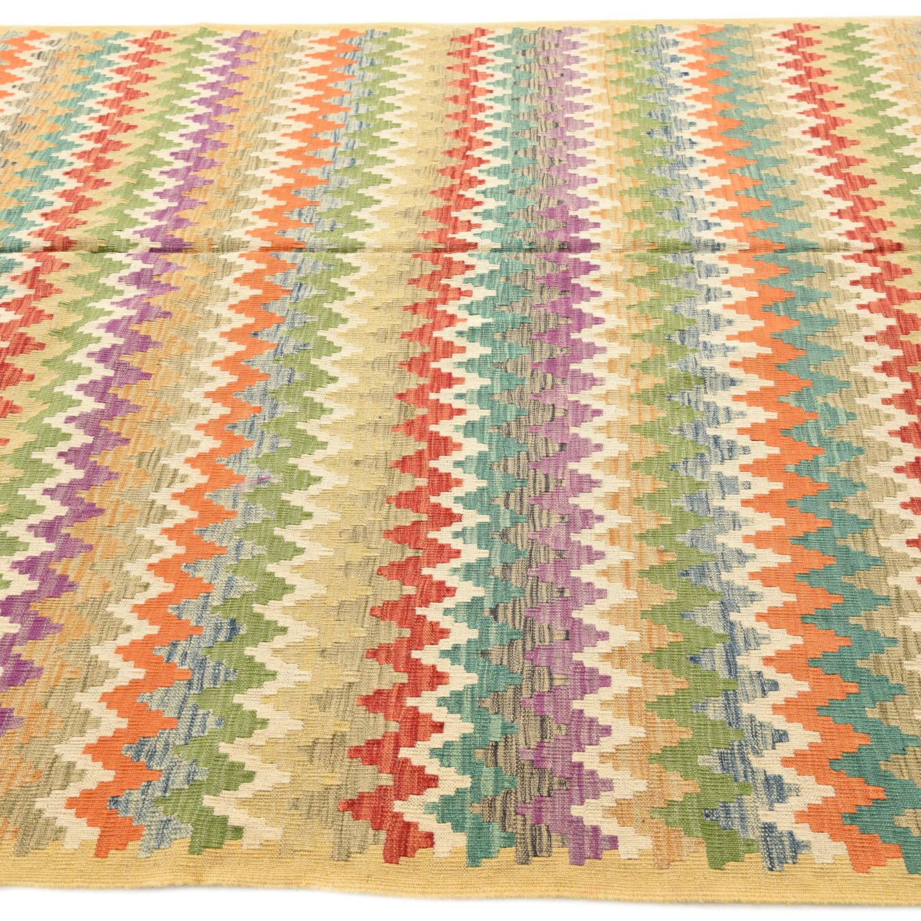 This Kilim Modern collection rug is handwoven from 100% wool, ensuring a durable and tactile texture that would hold up in high-traffic areas. Sized at 6x9, it features a vibrant multi-colored background with a diverse palette including beige, blue, olive, orange, peach, purple, terracotta, yellow, light blue, light green, and light salmon, allowing it to lend itself to a variety of interior color schemes. The rug exhibits a dynamic zigzag pattern, which introduces movement and a contemporary twist on the traditional kilim design.