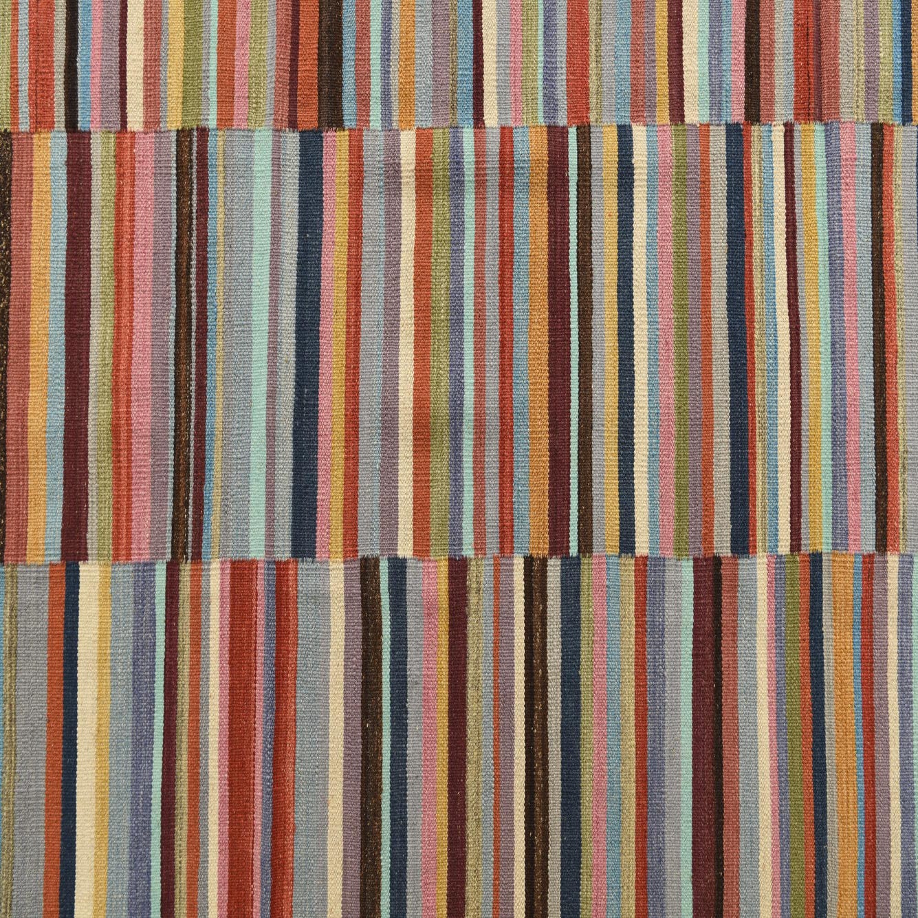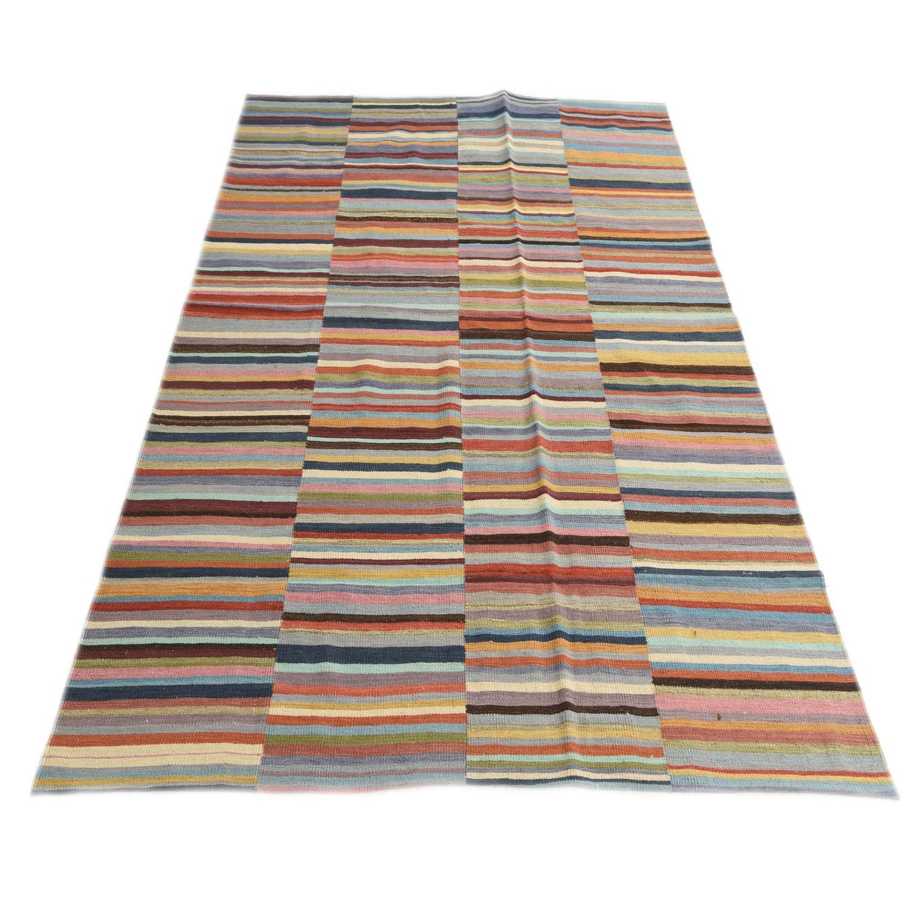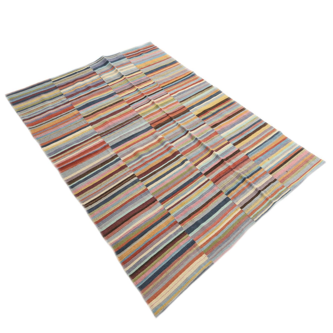 A 6x9 rectangular multi-colored flatweave wool rug with horizontal stripes in various widths, featuring shades of blue, red, orange, pink, and yellow.