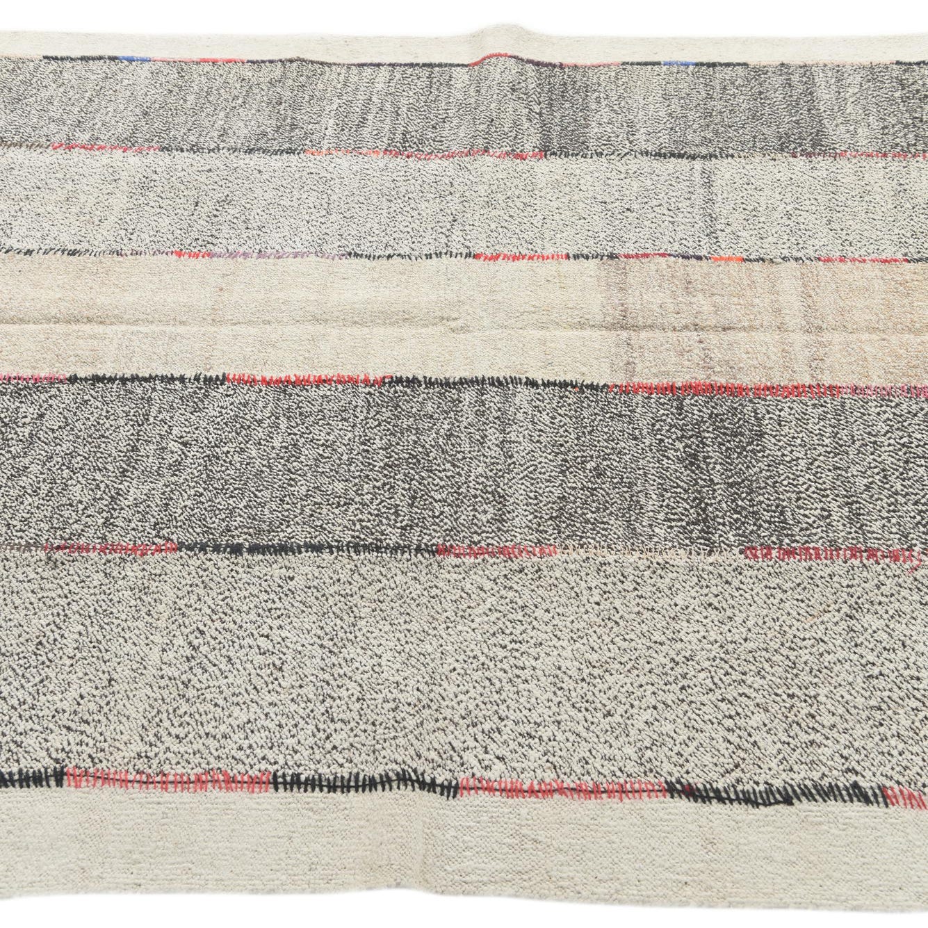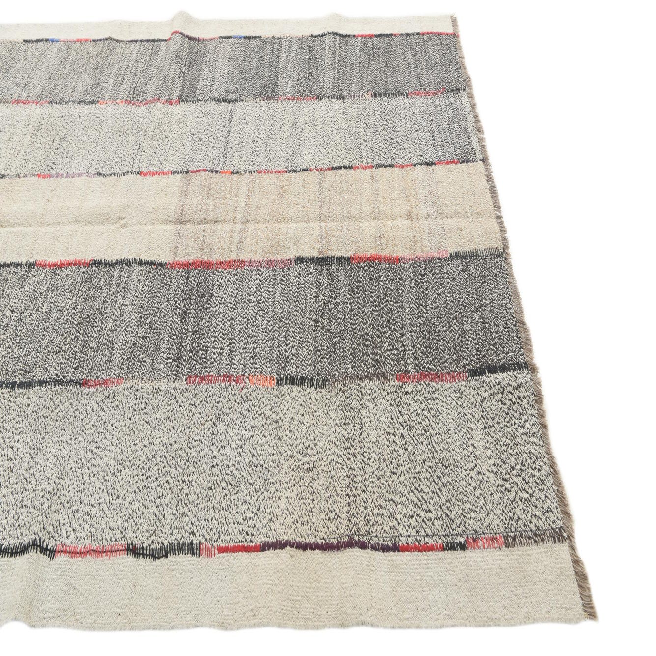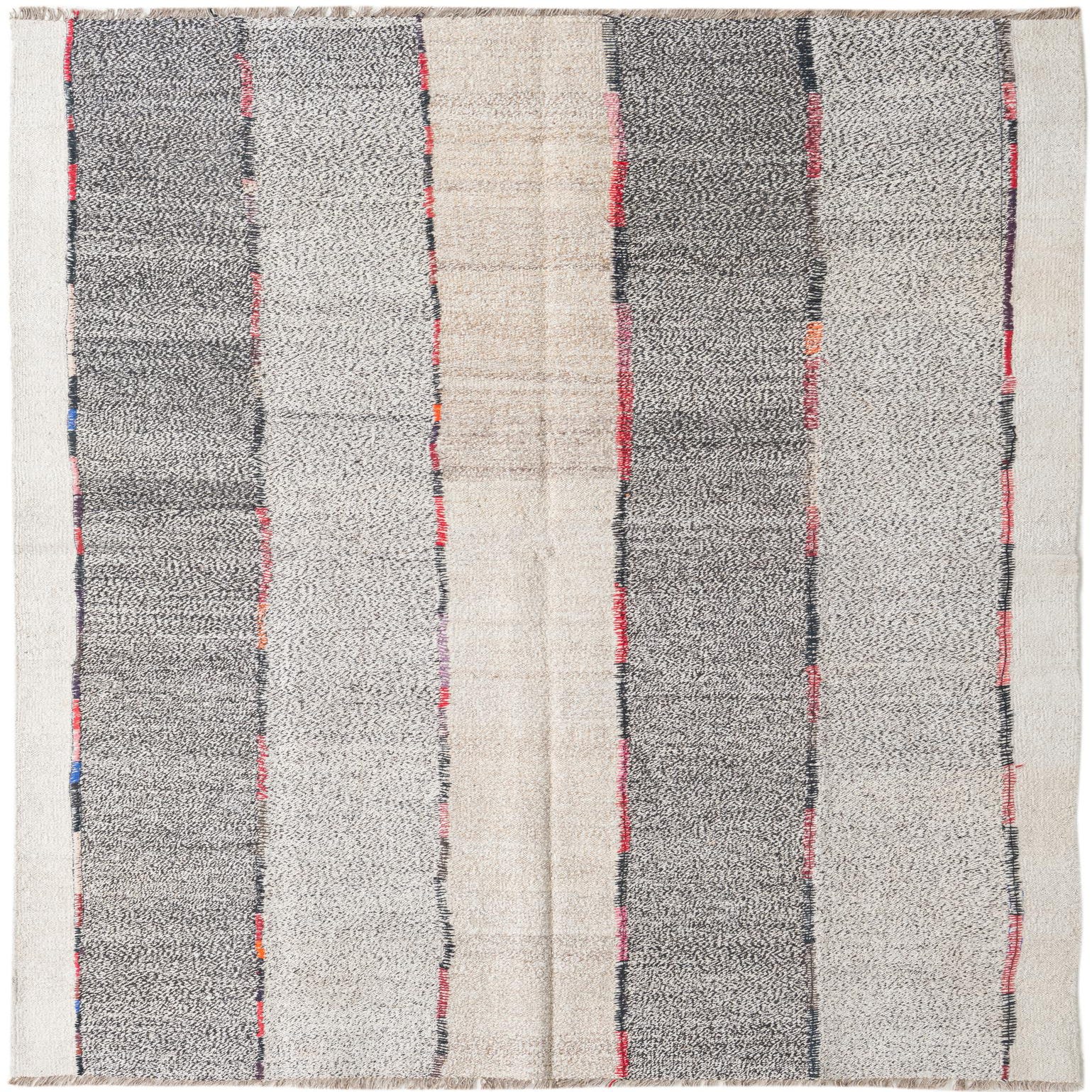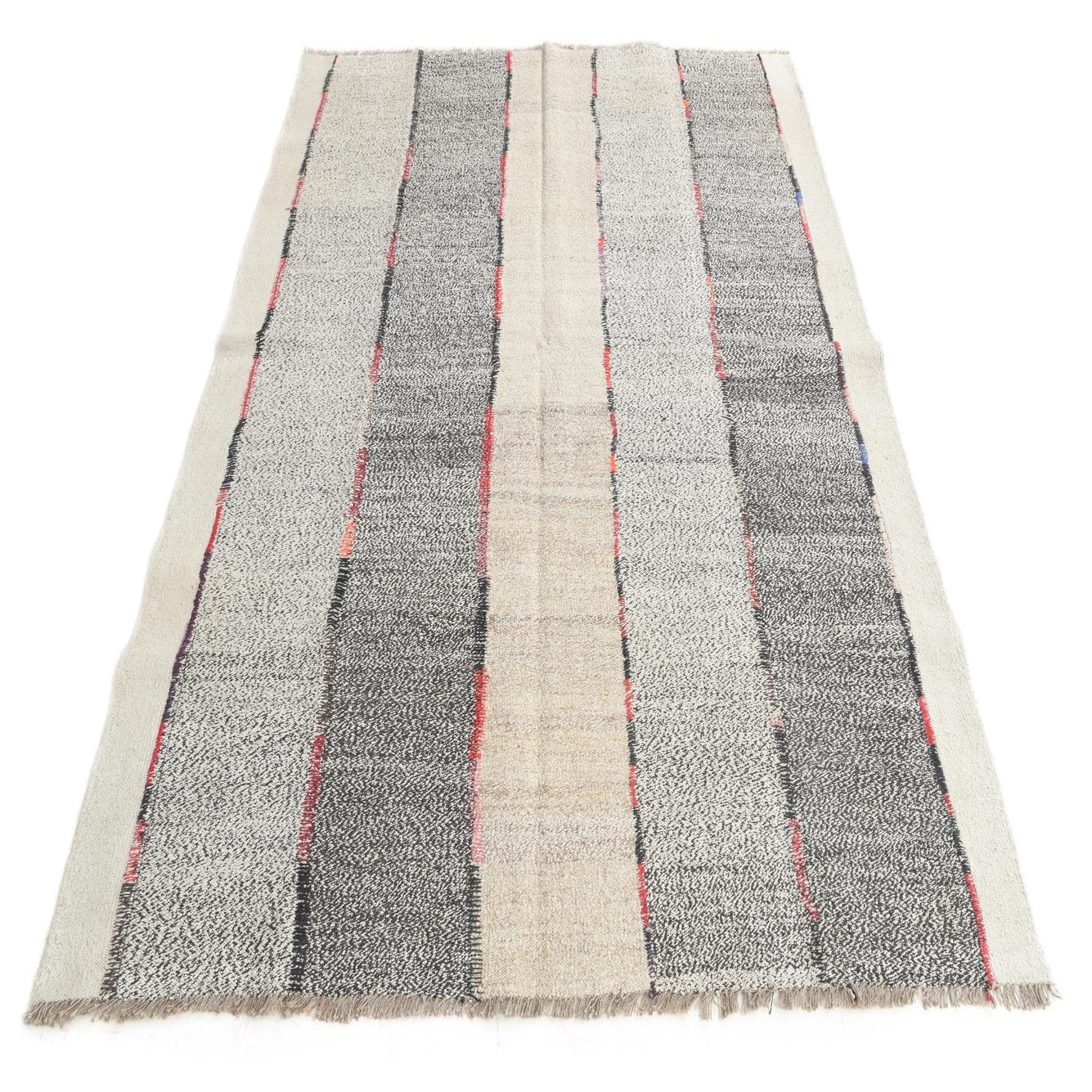 A 6x9 rectangular multi-colored tribal flatweave rug with alternating stripes of light and dark gray, beige, and thin colorful accents.