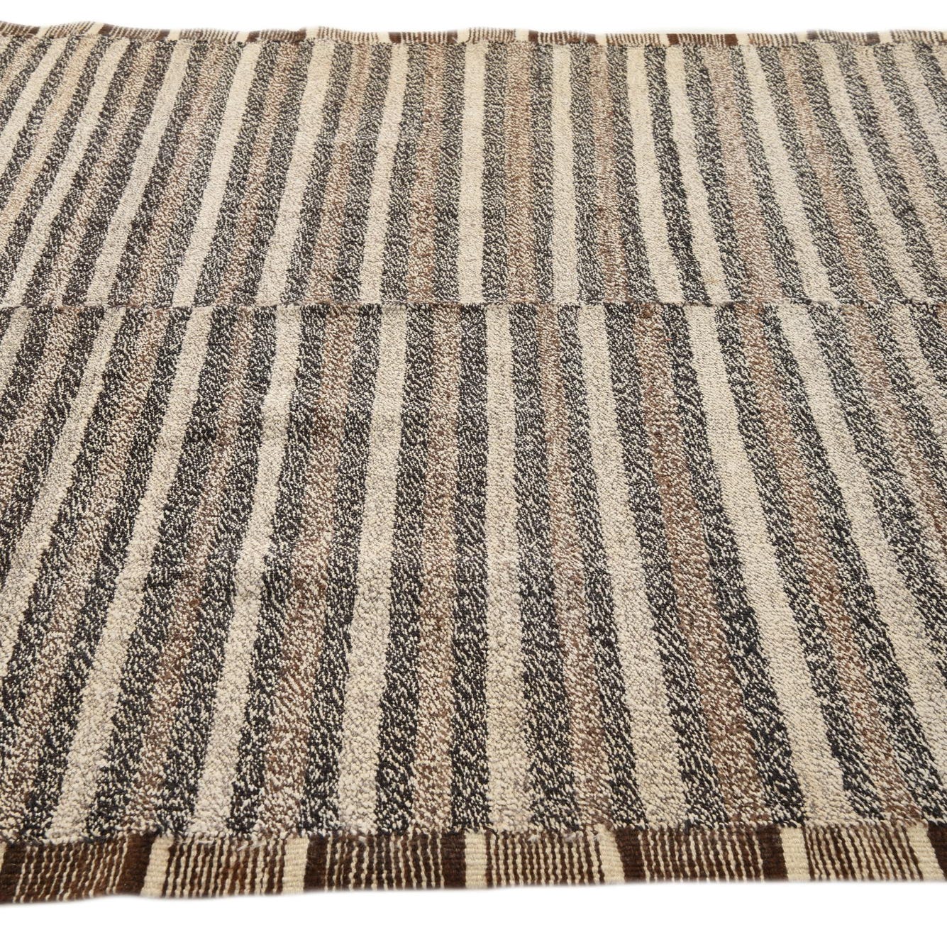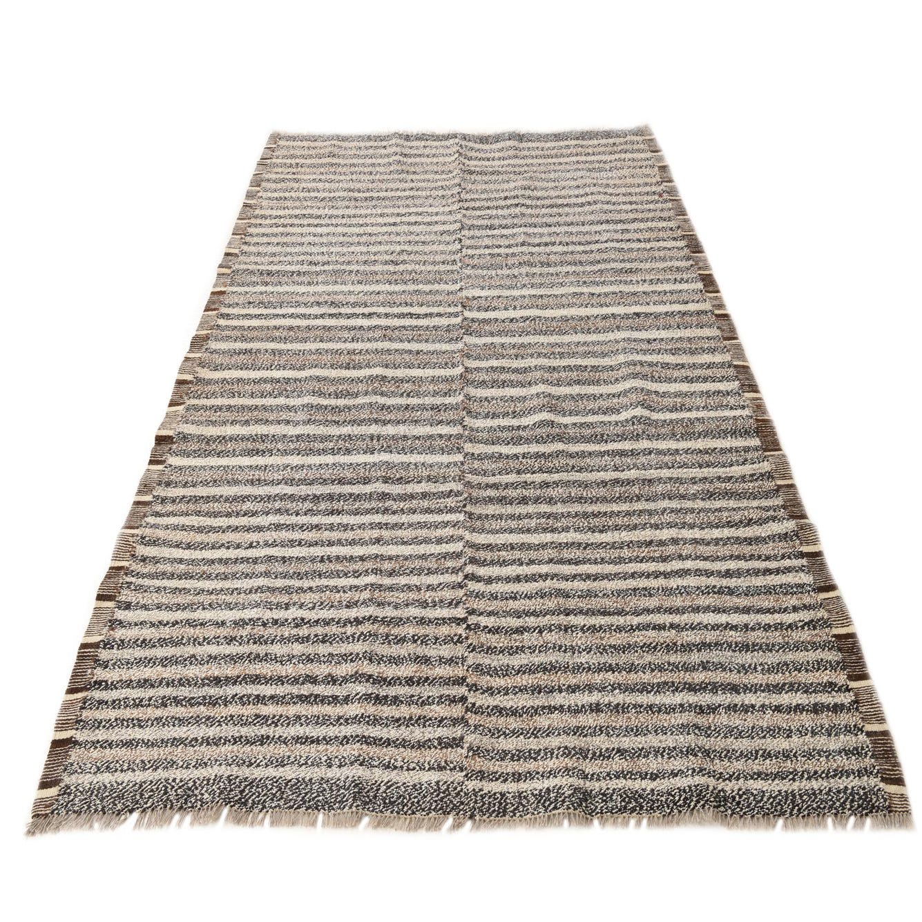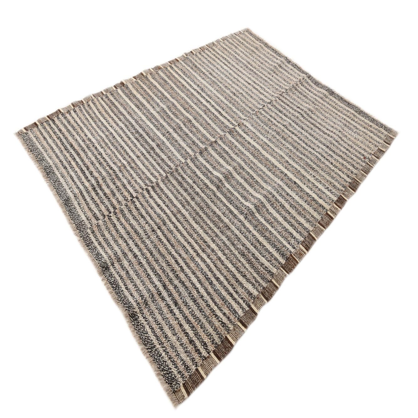A 6x9 rectangular Kilim Modern wool rug with horizontal stripes in varying shades of brown, beige, and off-white.