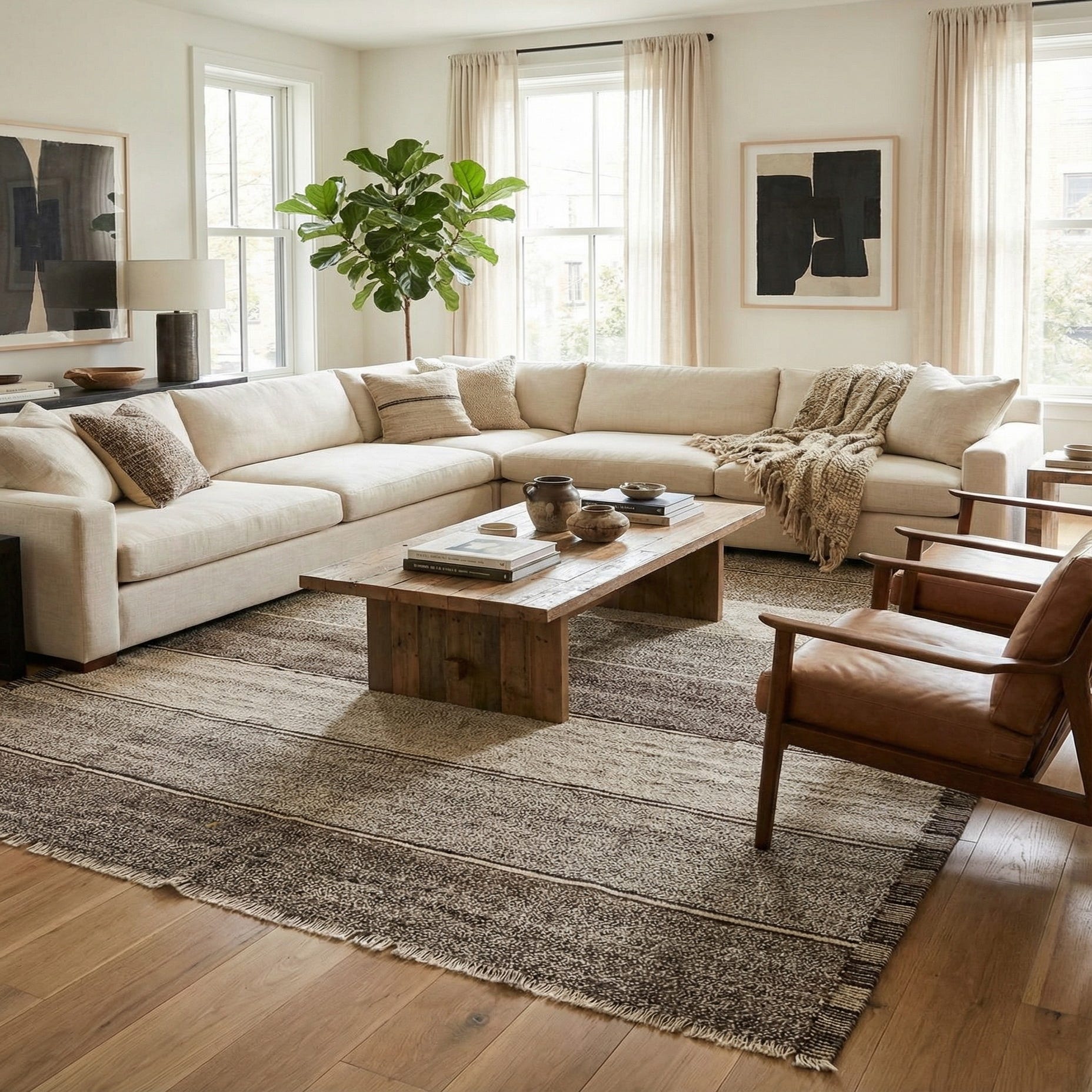 This piece's neutral yet rich color scheme allows it to seamlessly integrate into a multitude of decor styles. Its linear pattern works harmoniously in minimalist and Scandinavian-styled spaces, while the earthy brown tones complement mid-century modern and contemporary furnishings. The rug's uncomplicated design also makes it a suitable foundation for eclectic and bohemian settings, offering balance without overwhelming the surrounding decor.