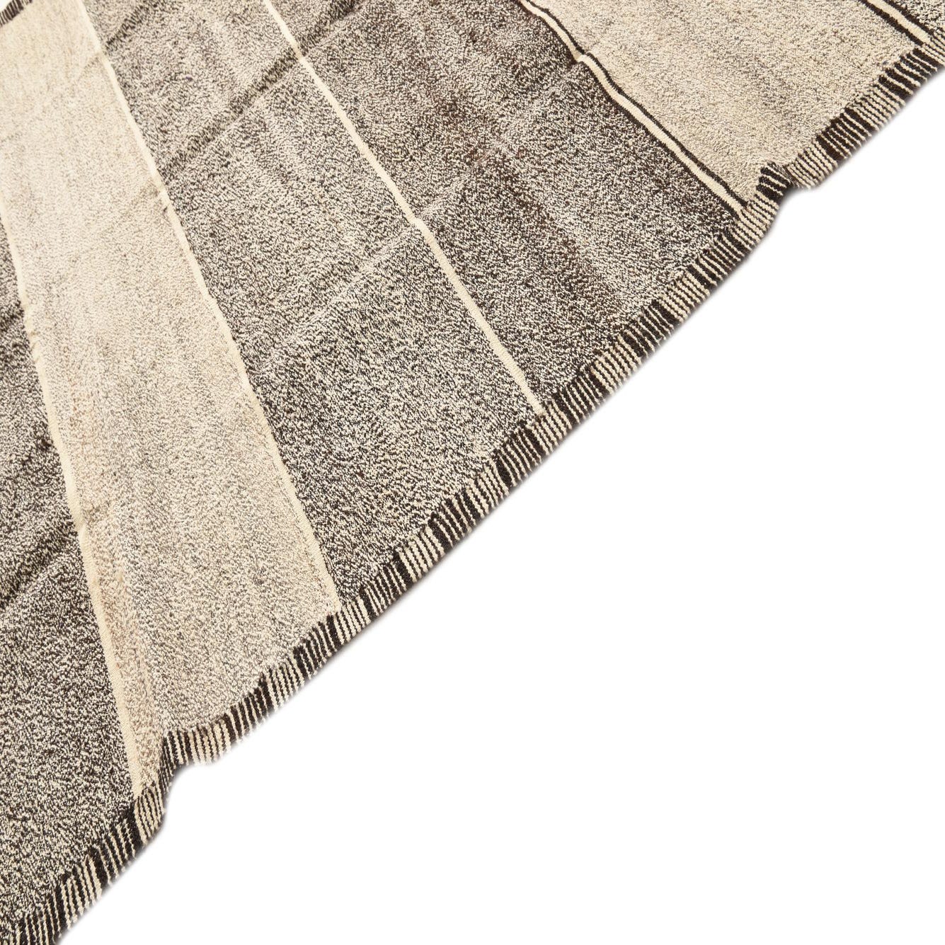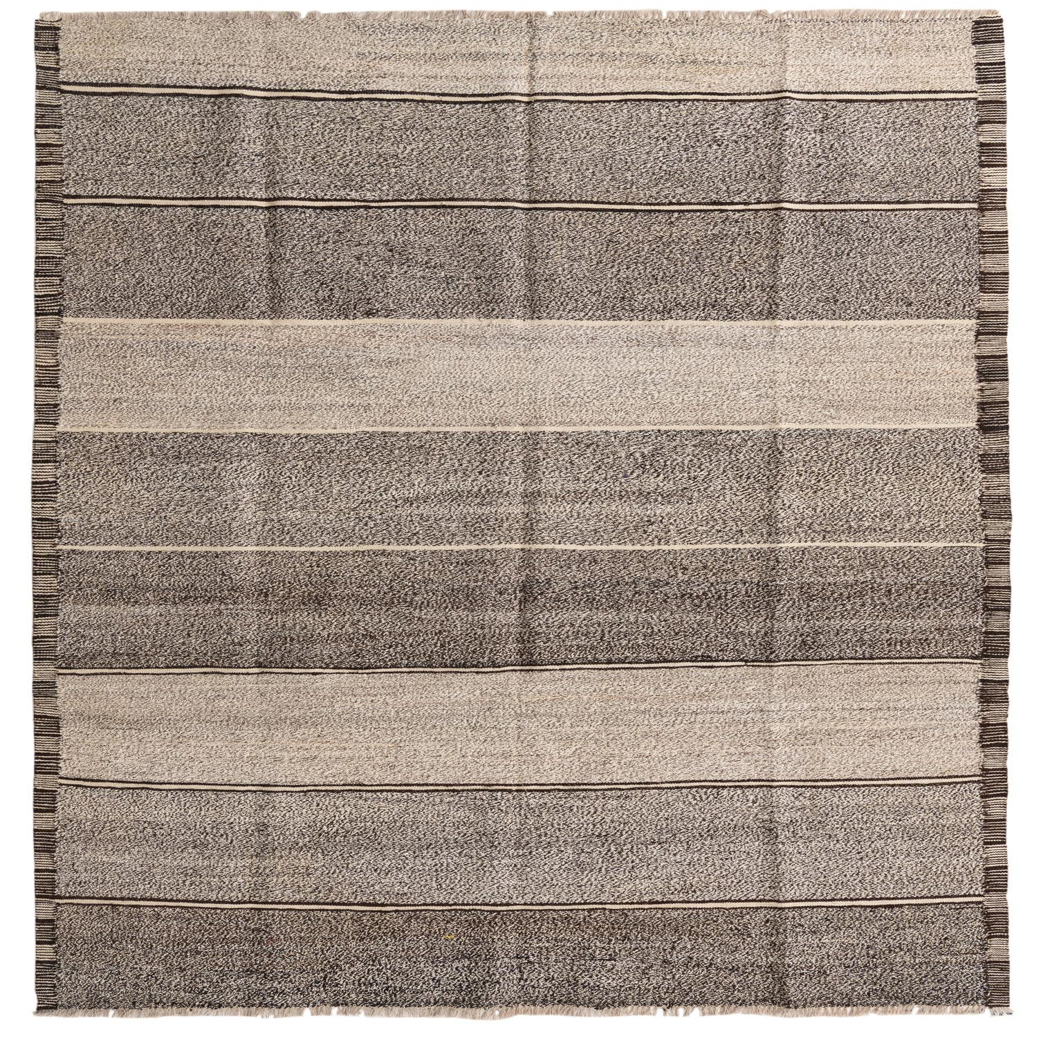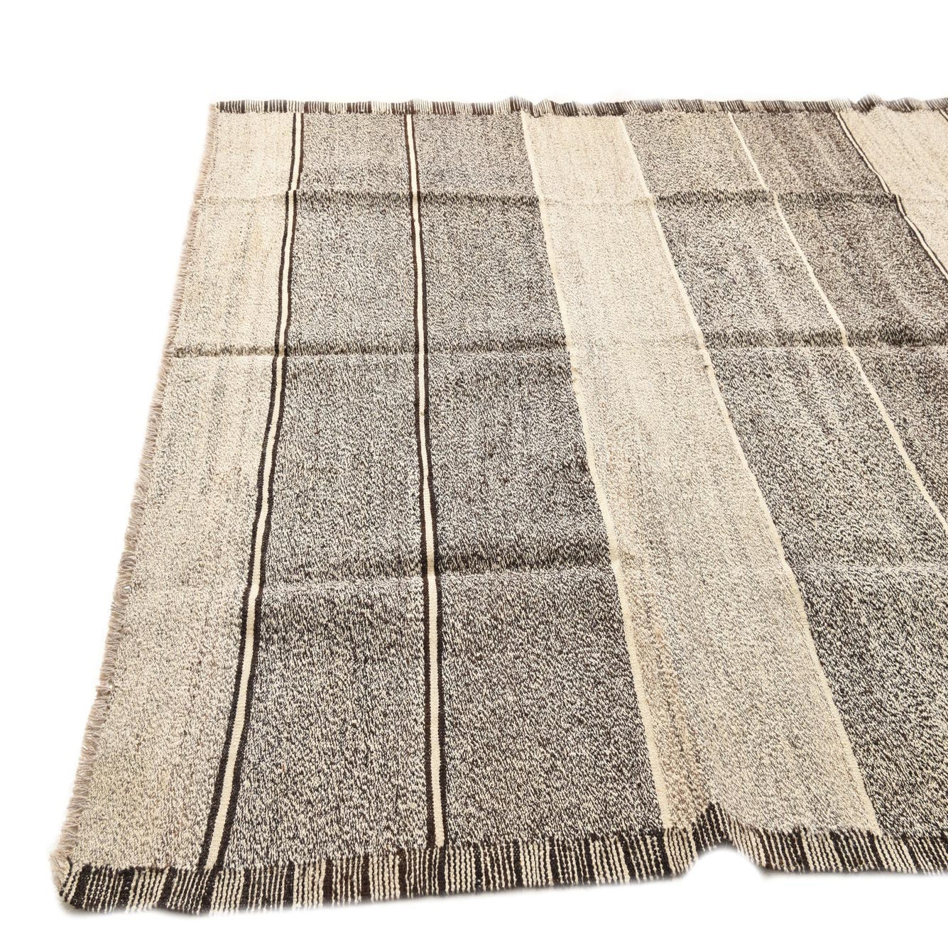 A 6x9 rectangular Kilim Modern rug with alternating horizontal stripes of dark gray and light beige, featuring a subtle tribal pattern and fringe.