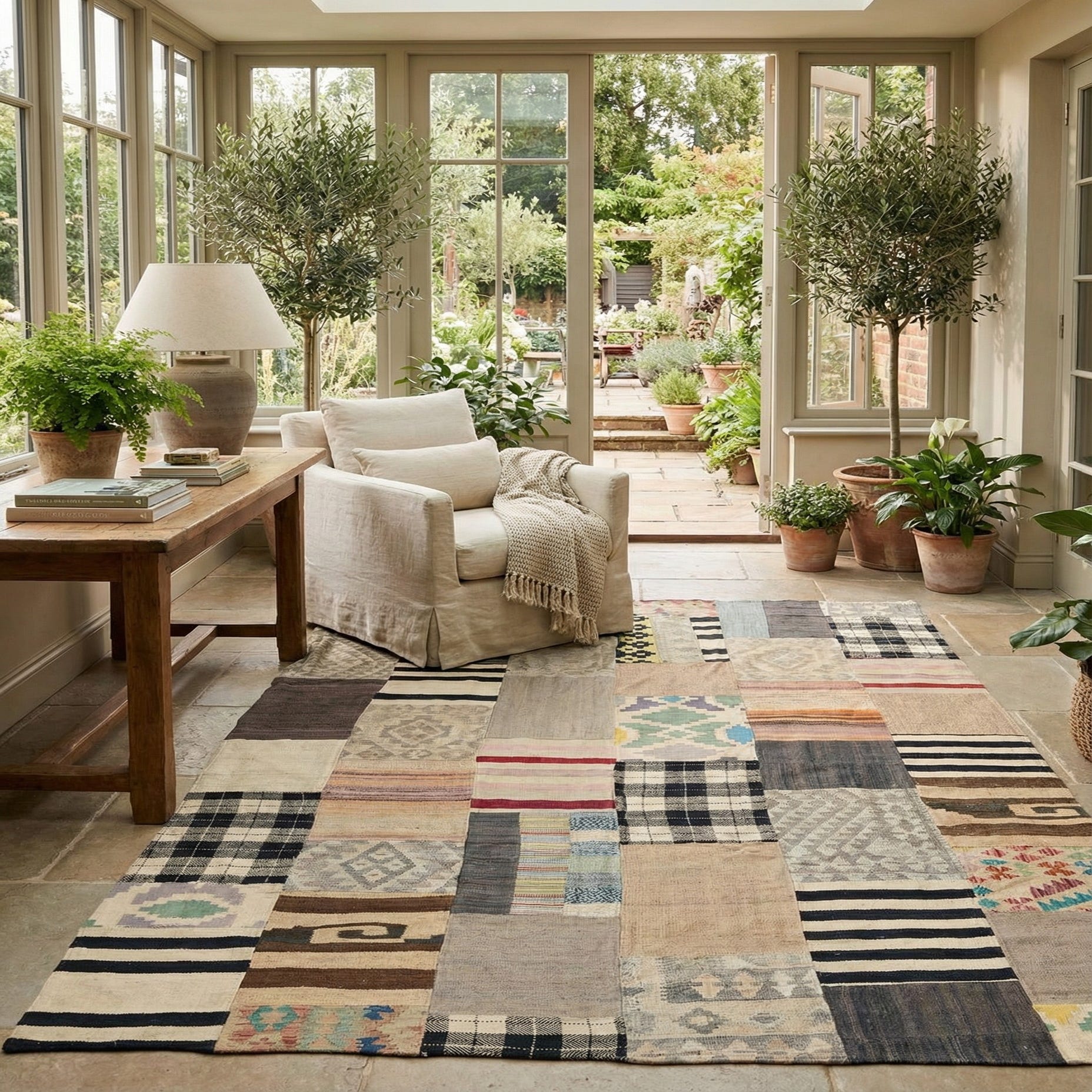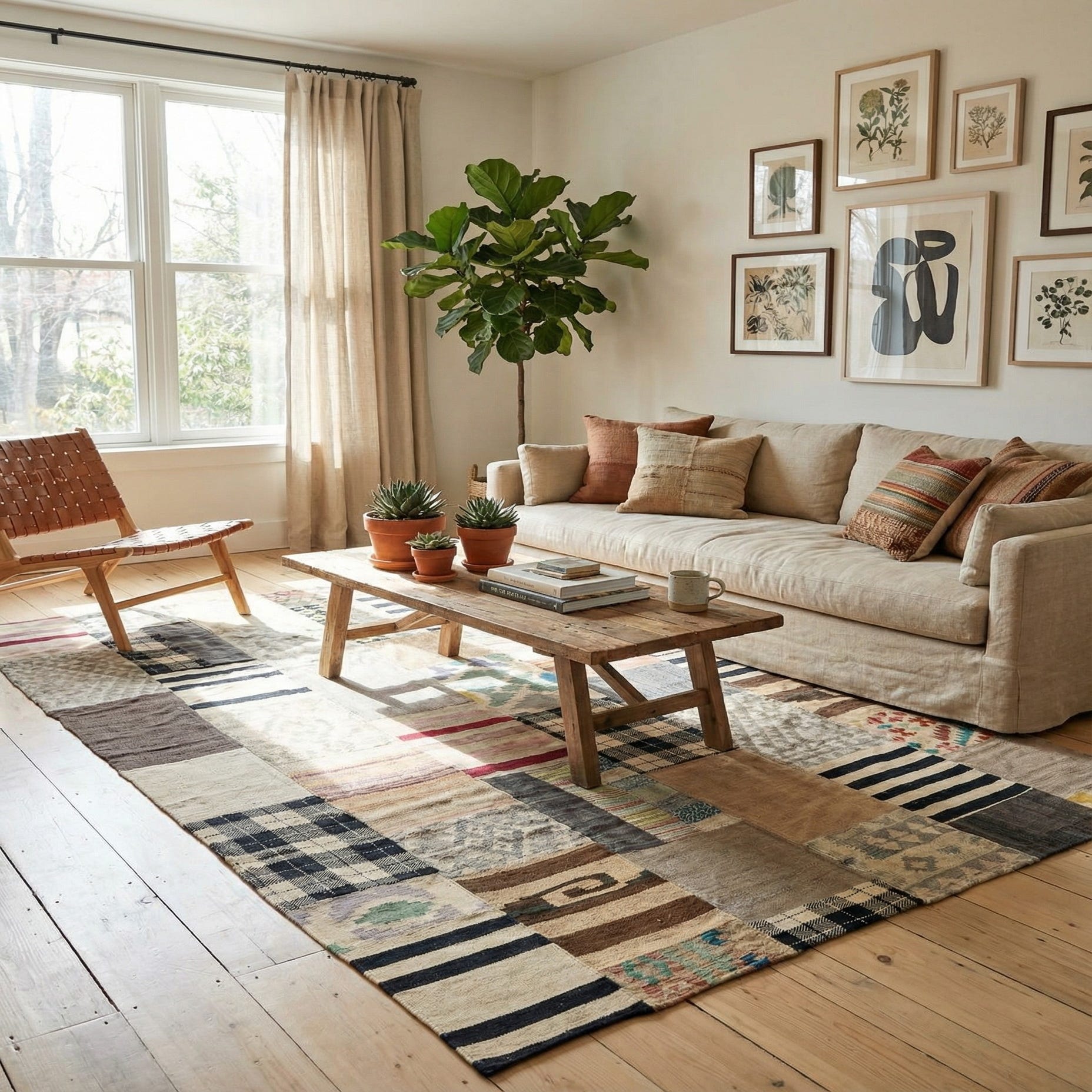 This rug works well where you want pattern and texture without the bulk of a deep pile: try it under a low-slung sofa in a relaxed living room, layered beneath a glass coffee table in a transitional space, or placed at the foot of a bed to introduce pattern without overwhelming the room. It also pairs nicely with warm wood furniture, leather seating and neutral upholstery, and complements interiors that blend global and contemporary elements—think bohemian mixes, modern farmhouse schemes or an eclectic study.