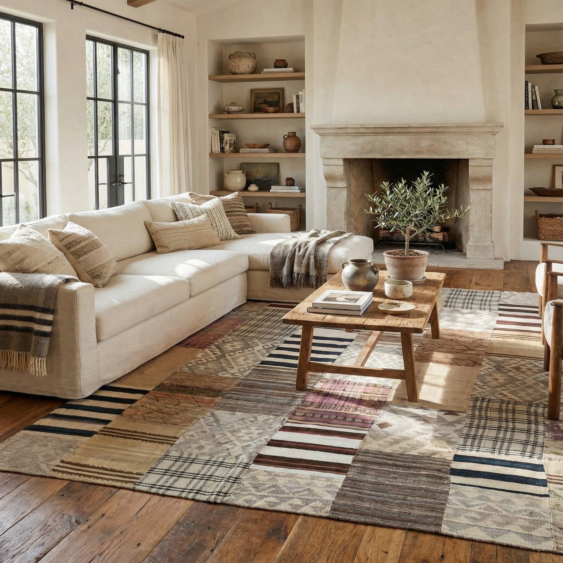 A 6x9 rectangular multi-colored wool Kilim Patchwork rug with Southwestern, tribal, and abstract patterns, perfect for a living room.