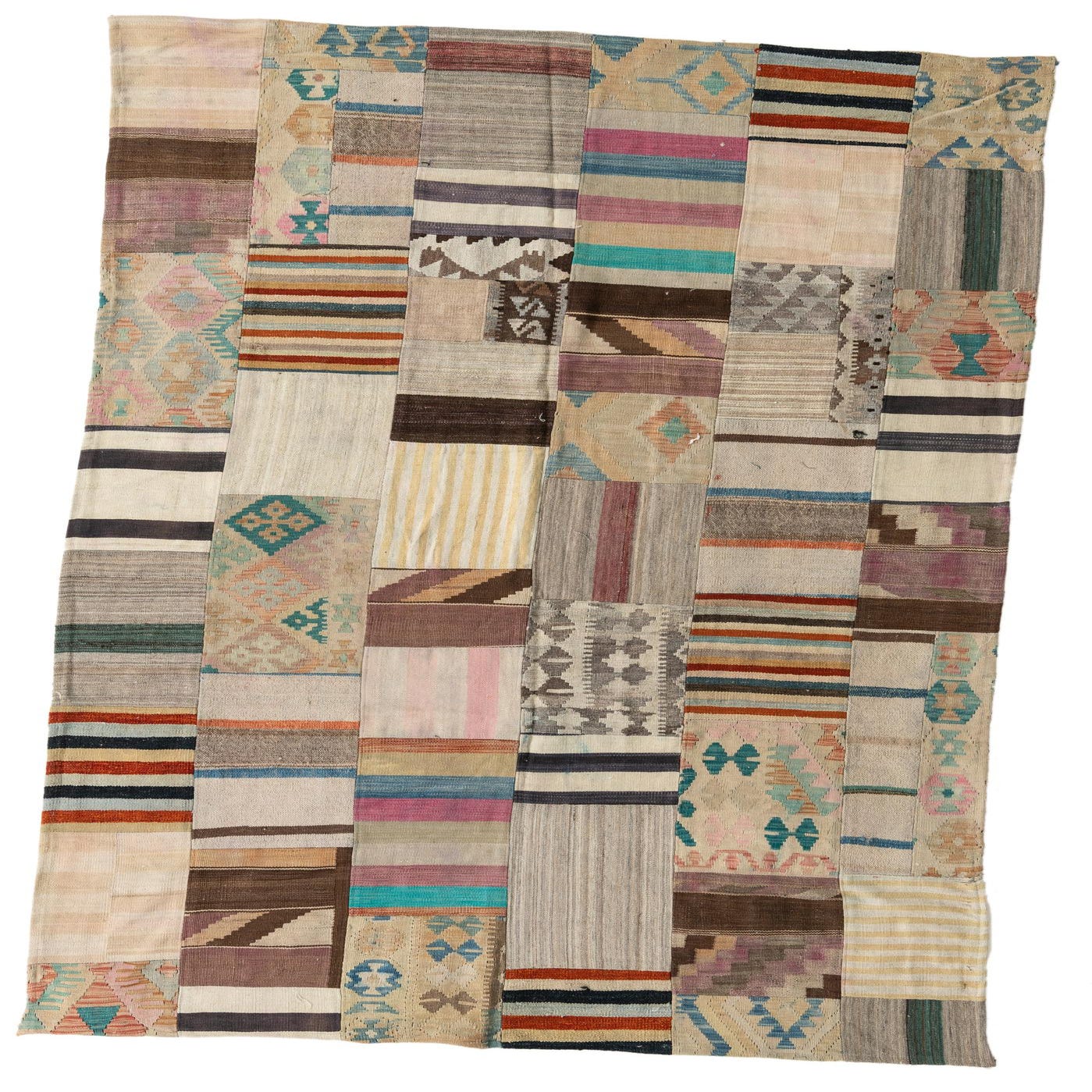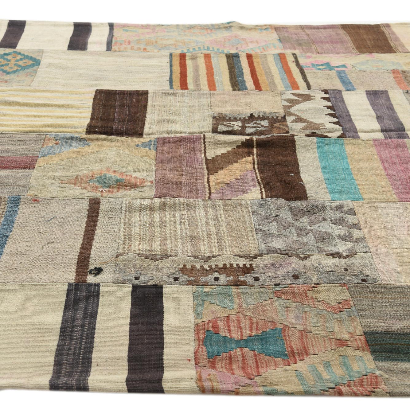 A 6x9 multi-colored rectangular Kilim Patchwork rug with Southwestern and tribal patterns, handmade from wool.