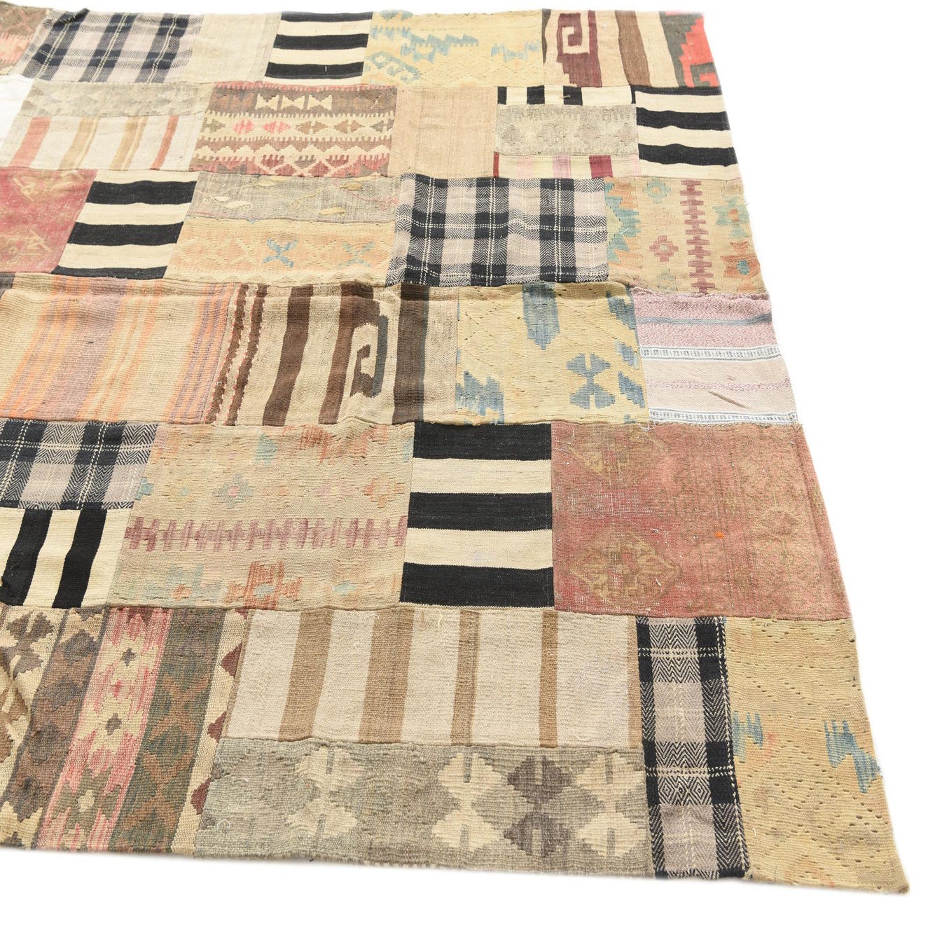 A 6x9 rectangular multi-colored wool Kilim Patchwork rug with Southwestern, tribal, and abstract patterns.