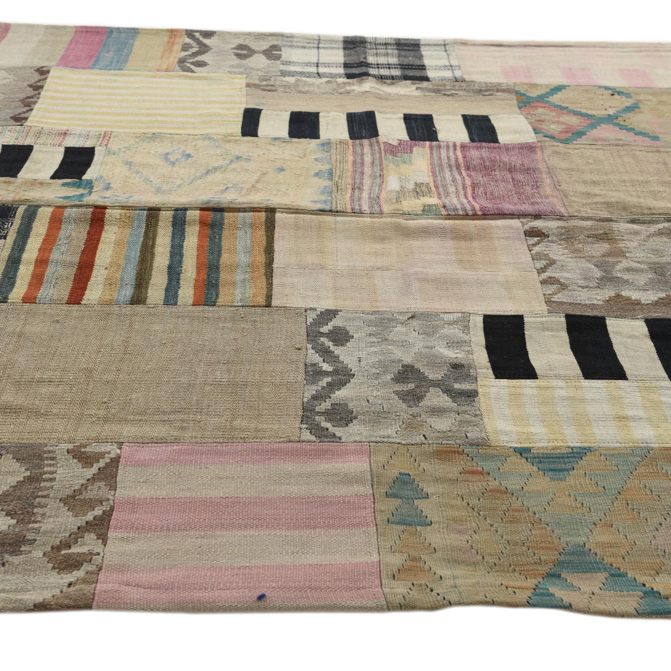 A 6x9 rectangular multi-colored wool Kilim Patchwork rug with Southwestern, tribal, and abstract patterns, suitable for a living room.