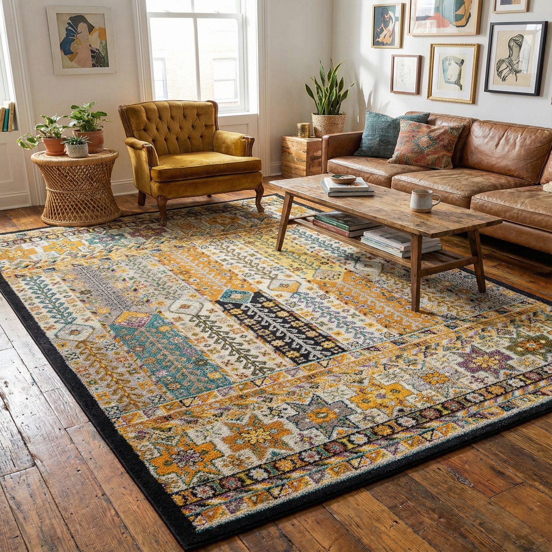 Primary color is Multi. Colors in this rug include: Multi, Blue, Brown, Gray, Green, Gold, Yellow, Navy Blue, Orange, Purple.