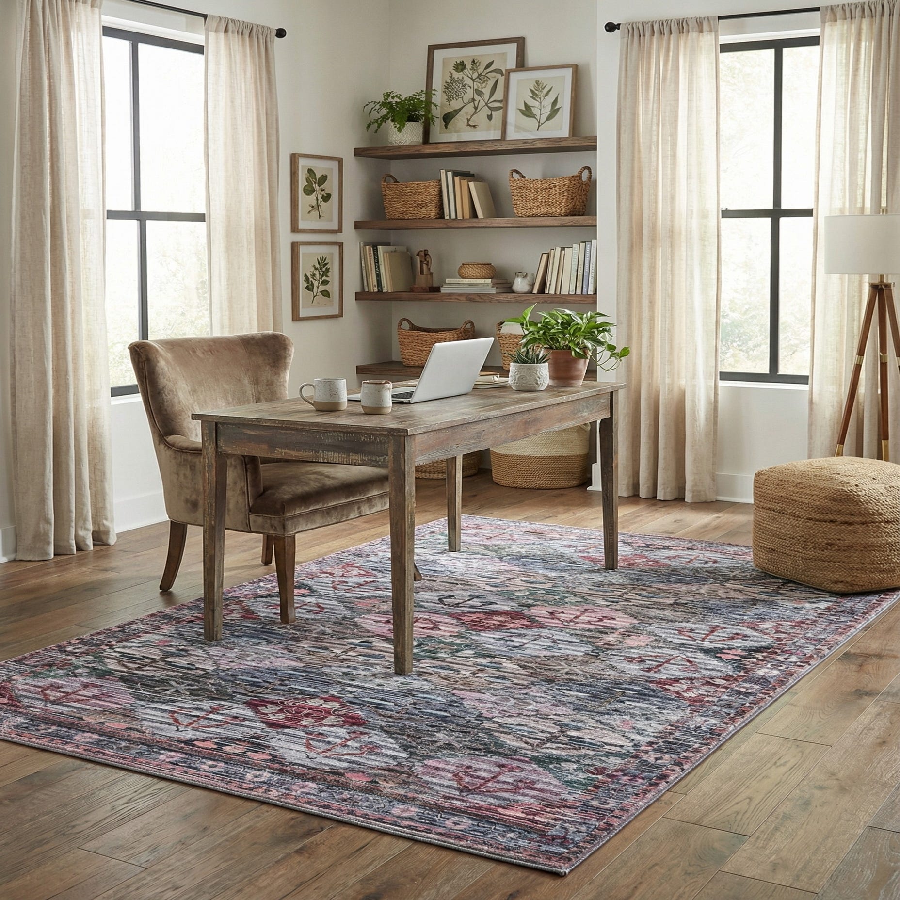 A 6x9 multi-colored rectangular rug with a distressed traditional floral and oriental pattern, featuring shades of pink, blue, and green.