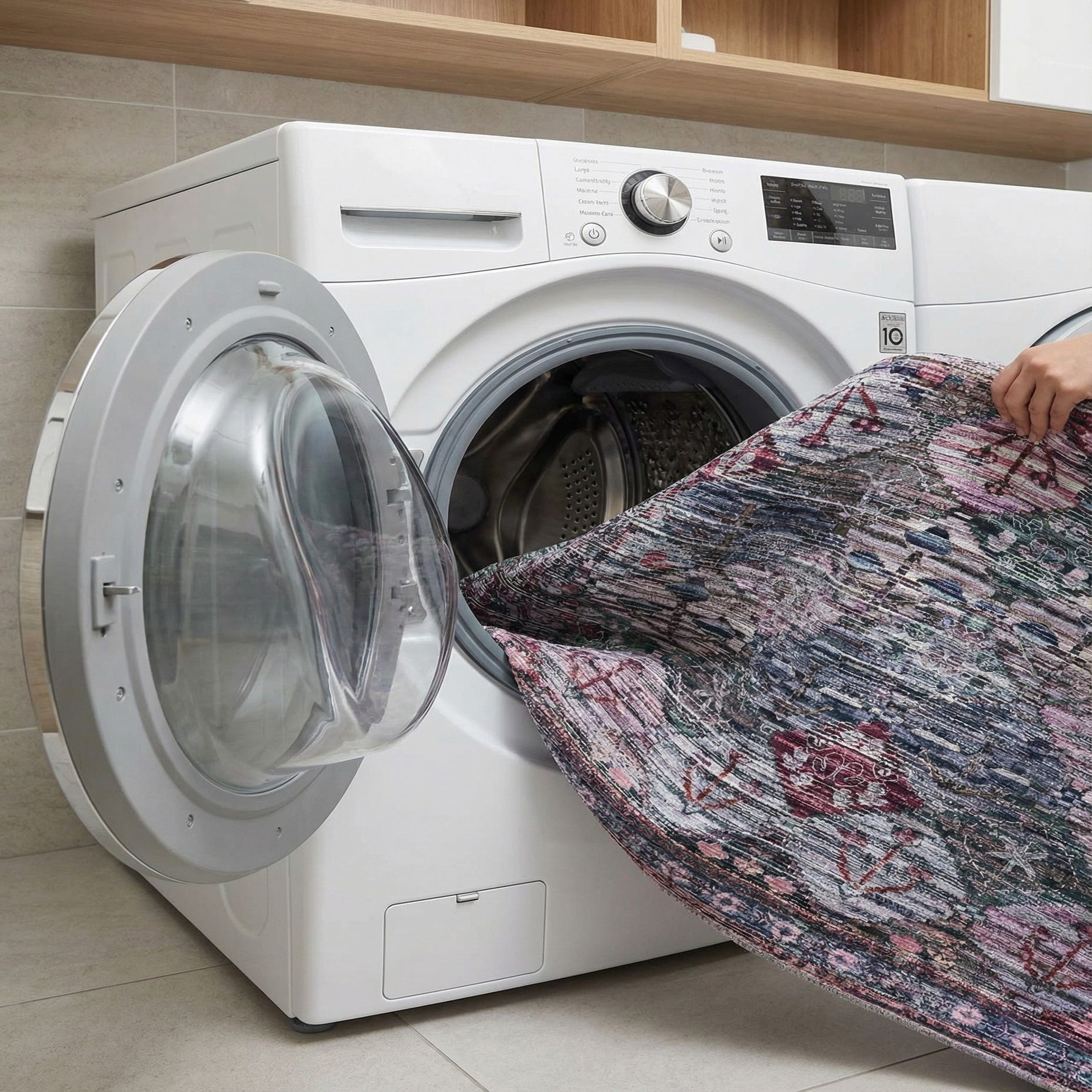A 6x9 multi-colored rectangular rug with a distressed traditional floral and oriental pattern, featuring shades of pink, blue, and green.