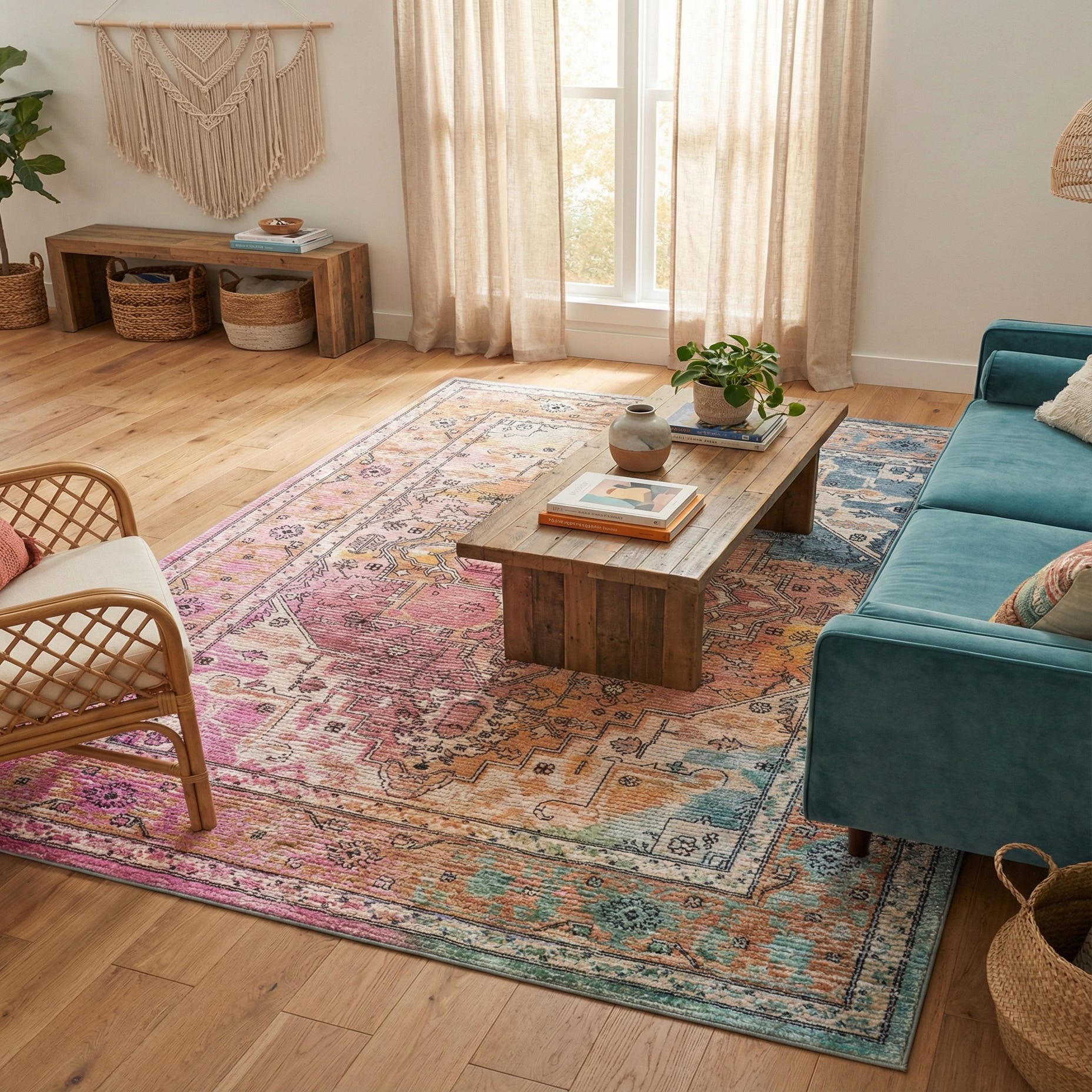 Warm, versatile colorways make this rug easy to style across rooms. It will anchor a living room seating group nicely, add layered color and comfort beneath a bed, or set a welcoming tone in an entry or dining area. Pair it with light wood furniture and neutral upholstery for a relaxed, modern look; with leather and darker woods to introduce contrast in traditional or transitional spaces; or layer it into a boho or eclectic scheme alongside woven textures and mixed patterns.