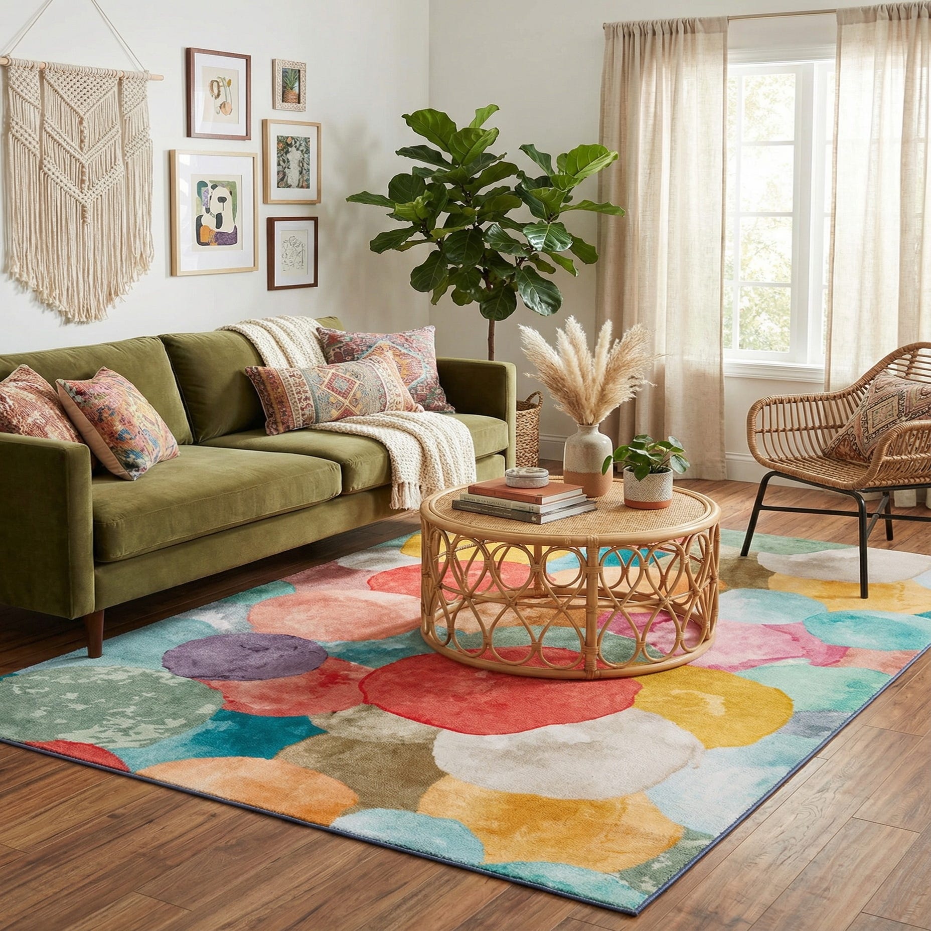 A 6x9 rectangular multi-colored rug featuring an abstract pattern of large, overlapping watercolor-style circles in shades of red, orange, yellow, blue, green, and purple.