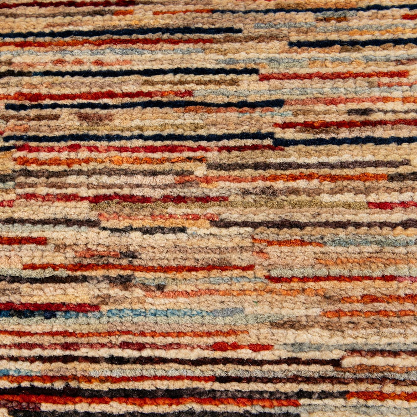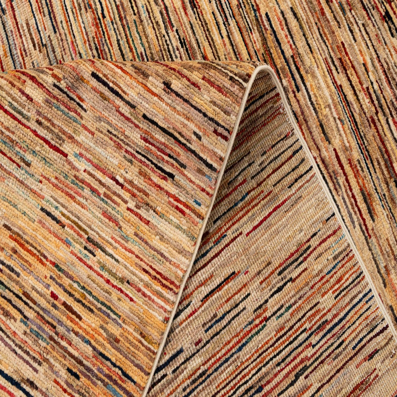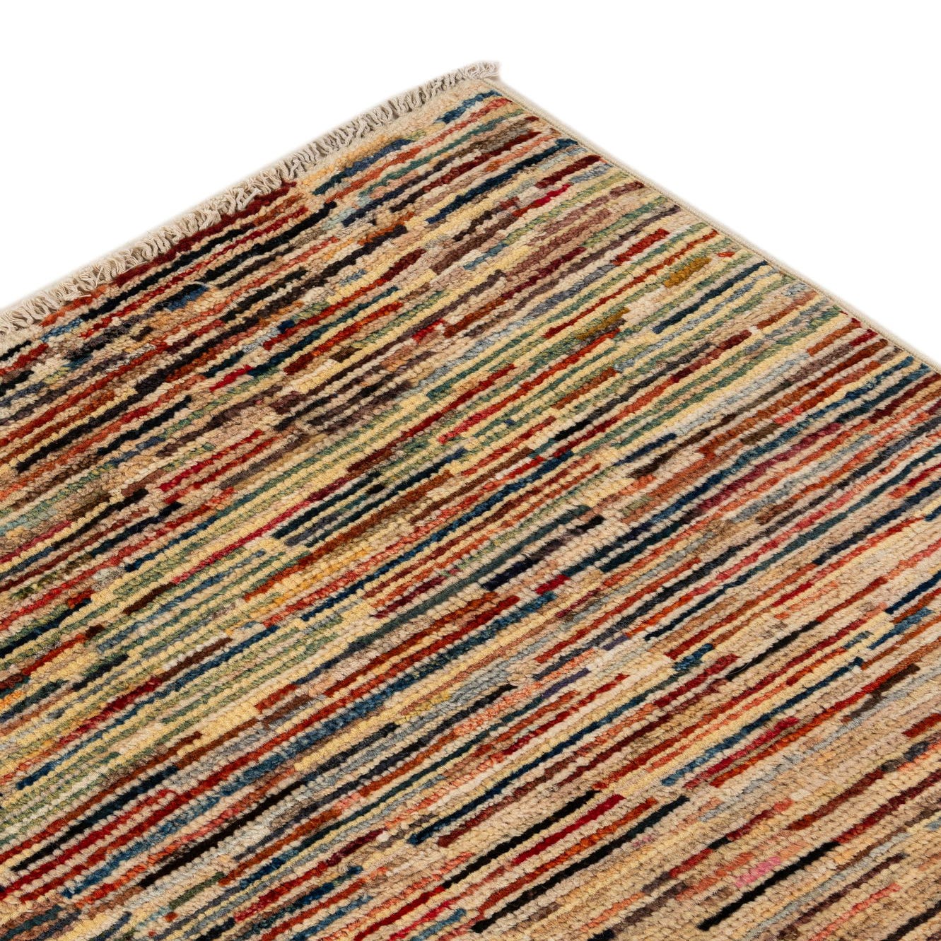 A 6x9 rectangular multi-colored modern wool rug with thin horizontal stripes, ideal for a living room.