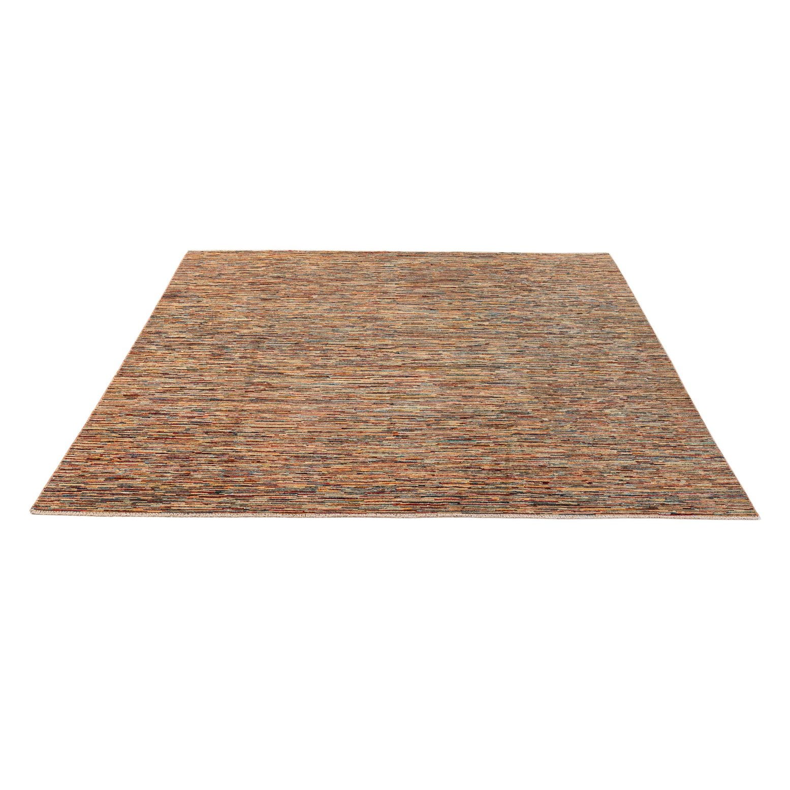 A 6x9 rectangular multi-colored modern stripe rug made of hand-spun wool, perfect for a living room.