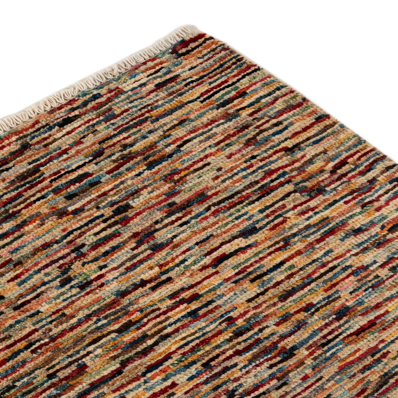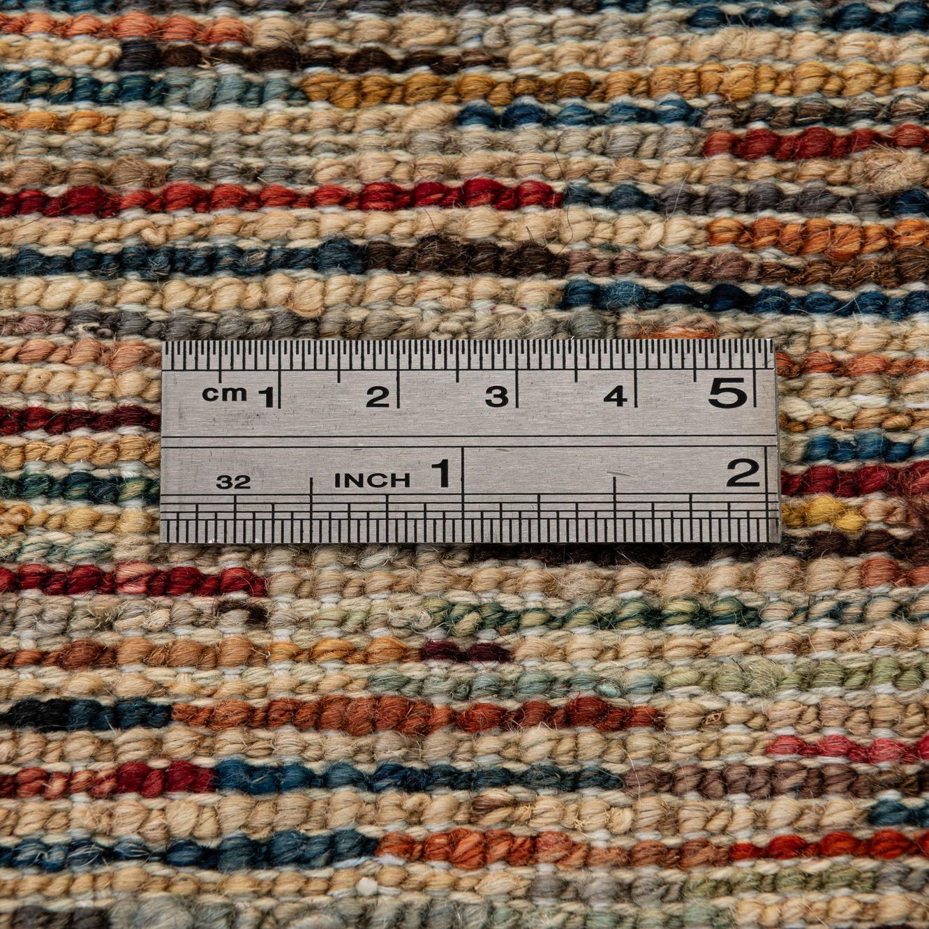 A 6x9 rectangular multi-colored modern wool rug with thin pile and a subtle stripe pattern.