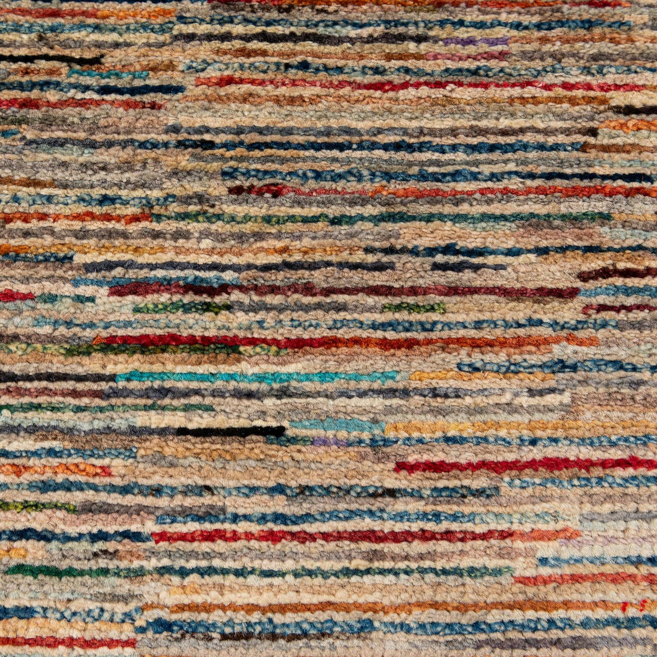 A 6x9 rectangular multi-colored wool area rug with a modern stripe pattern, ideal for a living room.