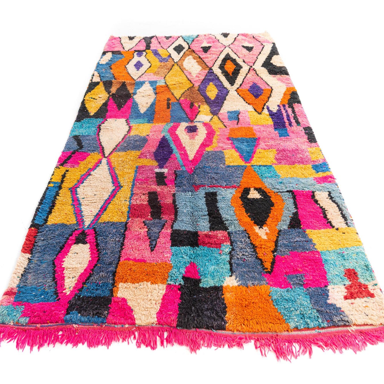 This Moroccan collection rug boasts a dynamic array of colors including black, blue, brown, gold, orange, purple, and pink on a multi-colored background, delivering a bold visual statement. Hand-knotted from 100% wool, this semi-antique piece measures 6x9 feet and exhibits a combination of durability and a soft, inviting texture. Its design features a rich tapestry of traditional geometric motifs, which are characteristic of Moroccan craftsmanship.