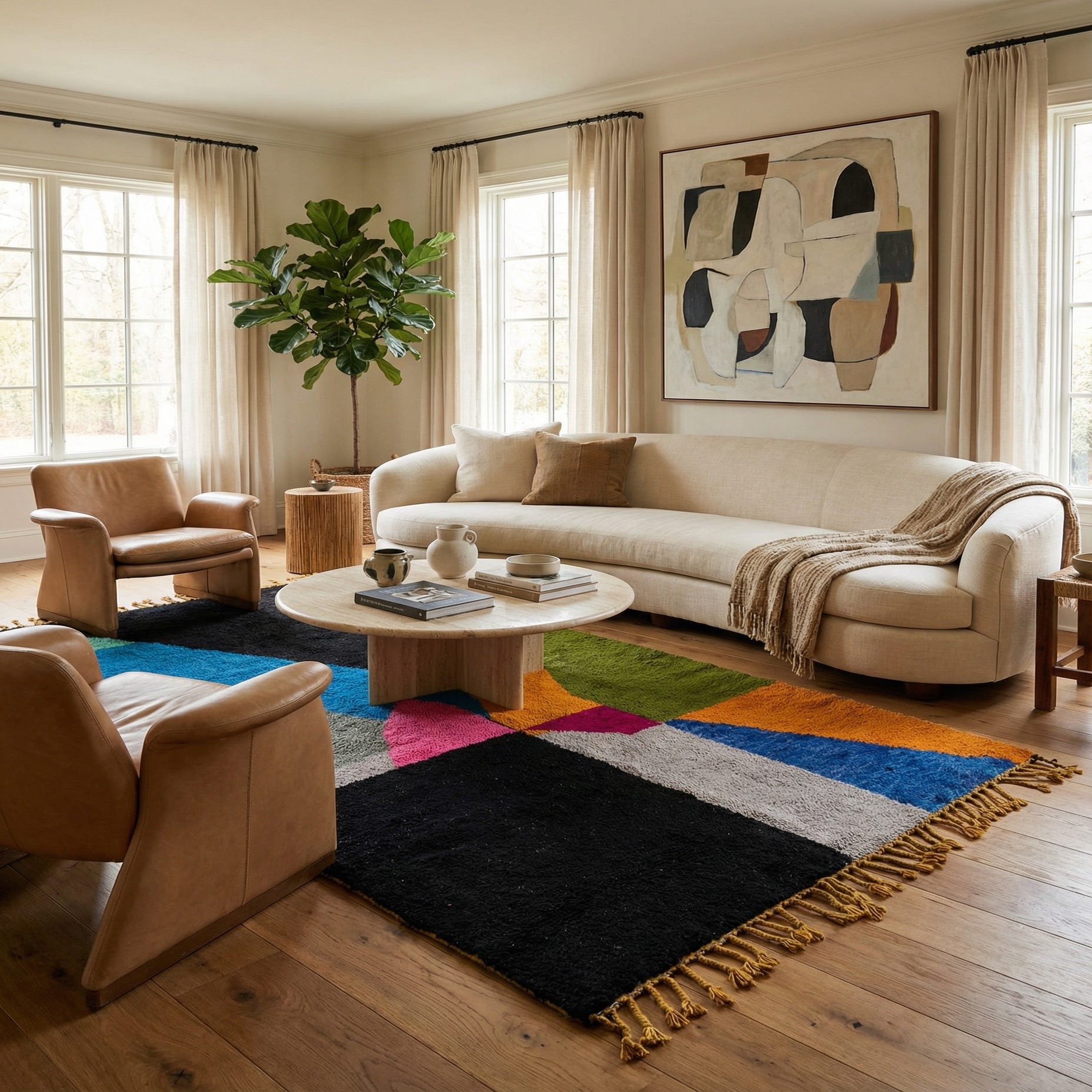 A 6x9 rectangular multi-colored shag rug with an abstract tribal pattern featuring black, blue, orange, green, pink, and gray geometric shapes, suitable for a living room.
