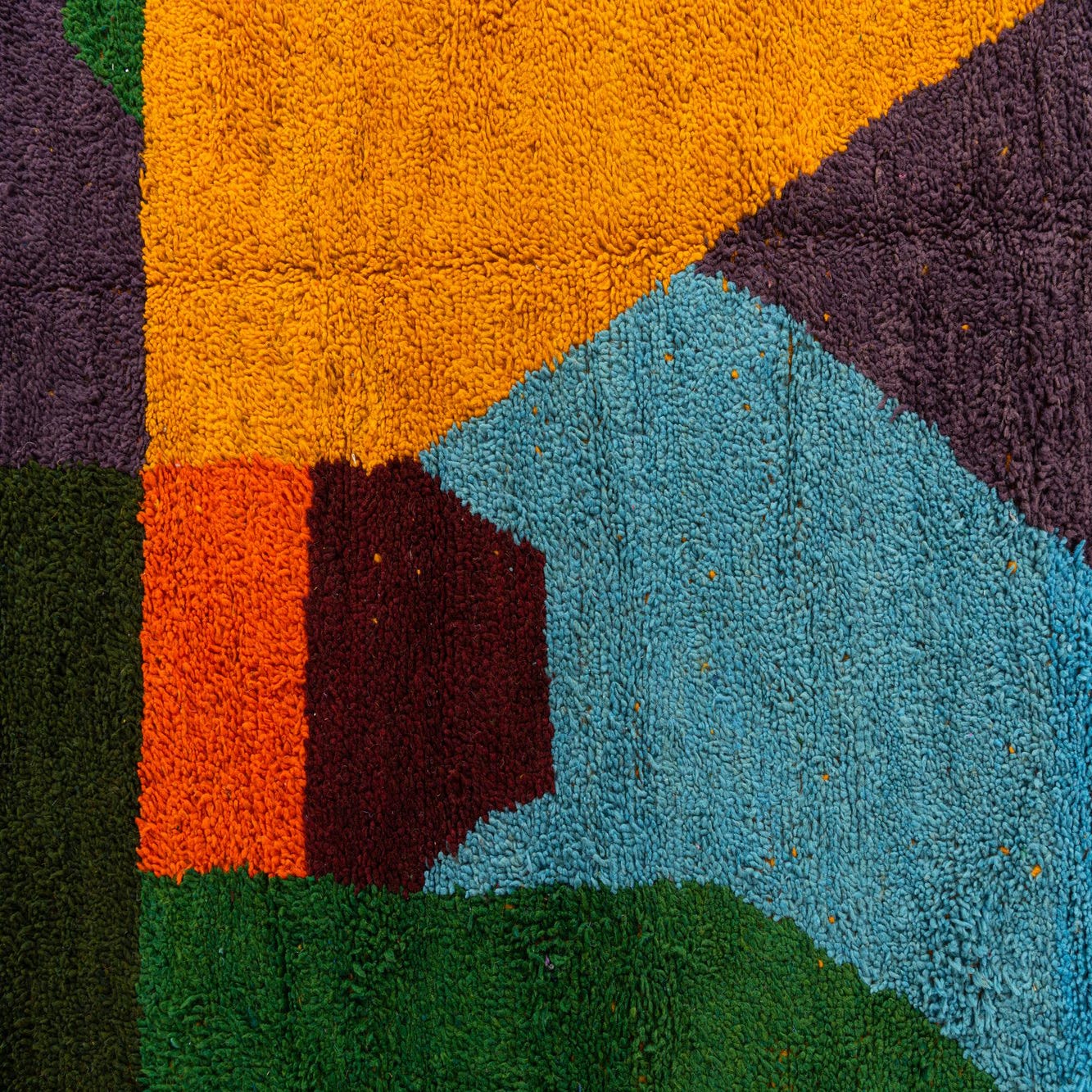 This Moroccan Collection rug is a hand-knotted piece measuring 6x9, rendered in 100% wool. A semi-antique rug, it is 40-60 years old and boasts a unique amalgamation of colors, including Black, Blue, Green, Hunter Green, Orange, Purple, Red, and Brown against a vibrant Multi-colored background. The rug displays a bold, geometric pattern with a dynamic array of shapes that catch the eye without overwhelming the space.