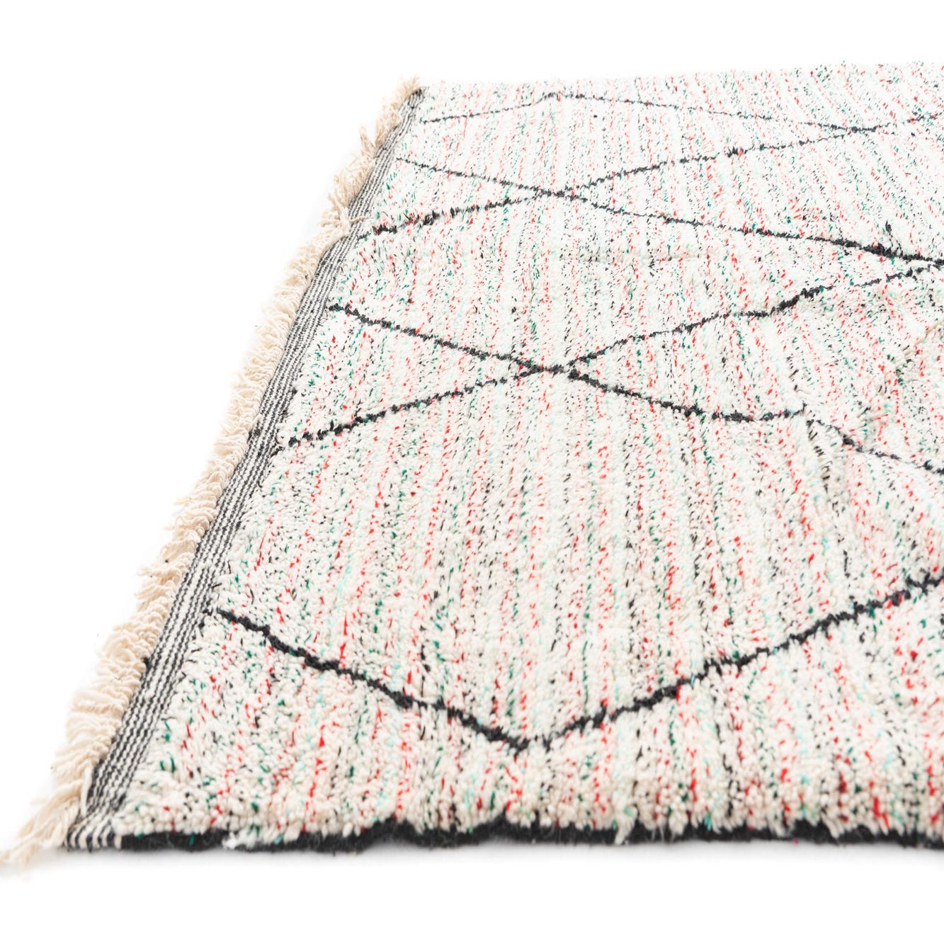 Hand-knotted in 100% wool, this rug pairs a soft, slightly plush pile with a graphic diamond lattice worked in strong black lines. The background is a multi-tonal weave of ivory, light blue, blue and red threads that form subtle horizontal striations across the field, giving the surface a lived-in, textured look. Running your hand over it, you’ll notice the contrast between the raised black pattern and the cushioned wool ground, a tactile balance that adds depth without heaviness.