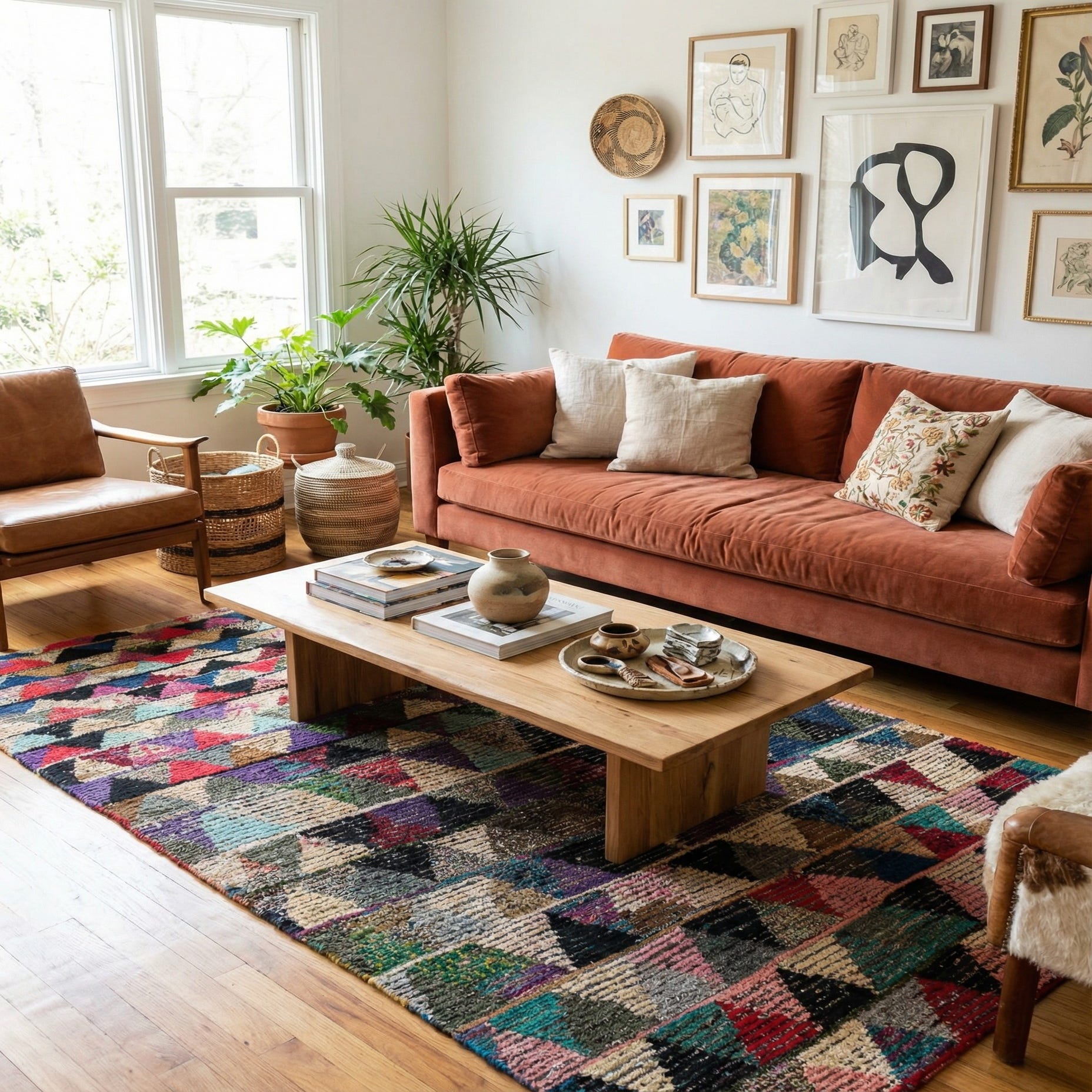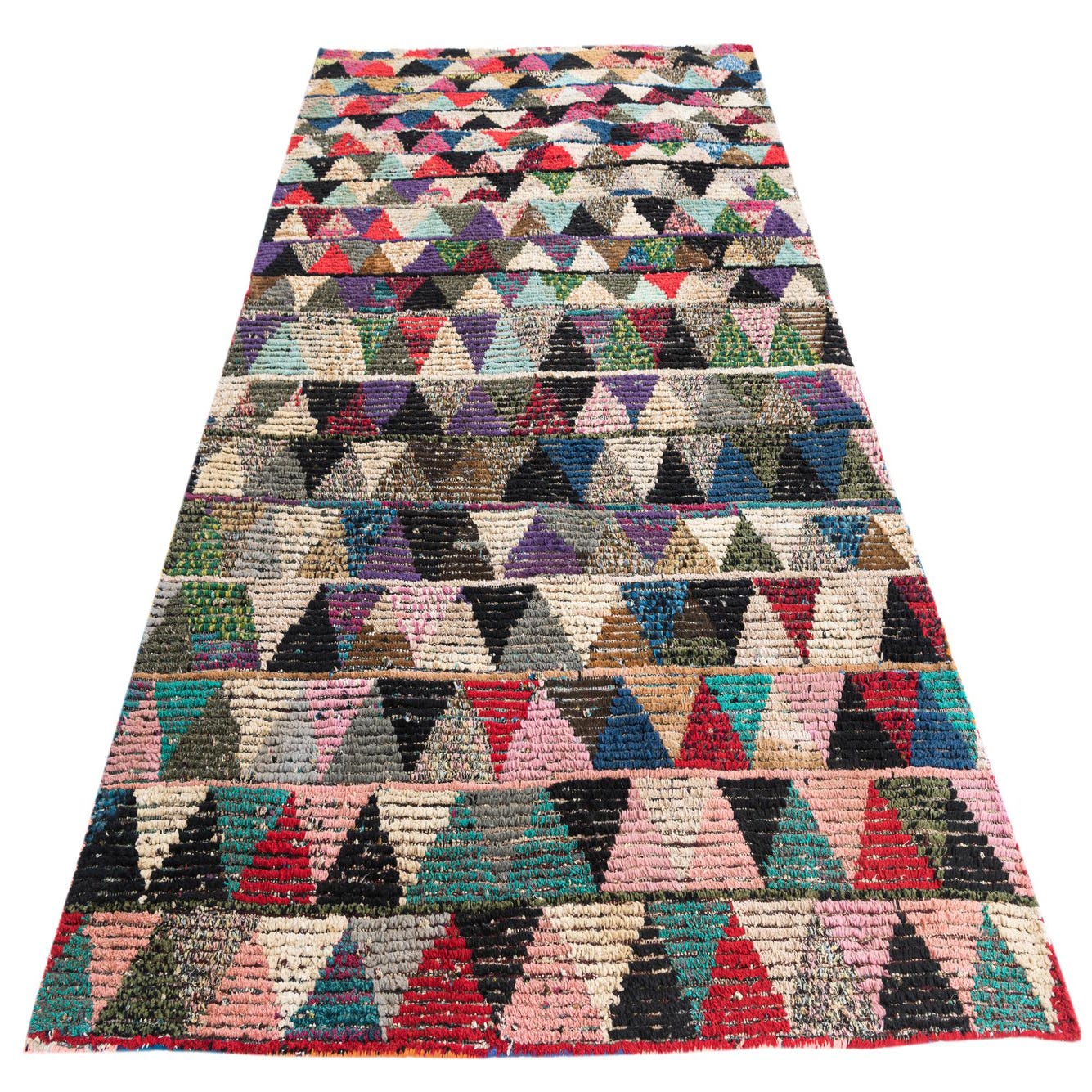The bold geometric pattern offers a contemporary twist on traditional Moroccan motifs, making this rug a versatile addition to a variety of interiors. The vivid color palette is designed to complement both neutral and bold decor settings, ensuring this piece can serve as a statement rug in a minimalist space or blend seamlessly into a more eclectic or bohemian styled room. Its durable construction suits high-traffic areas such as living rooms, studies, or dining areas, while its artistic flair would be just at home in creative spaces or modern offices seeking a touch of warmth and vibrancy.