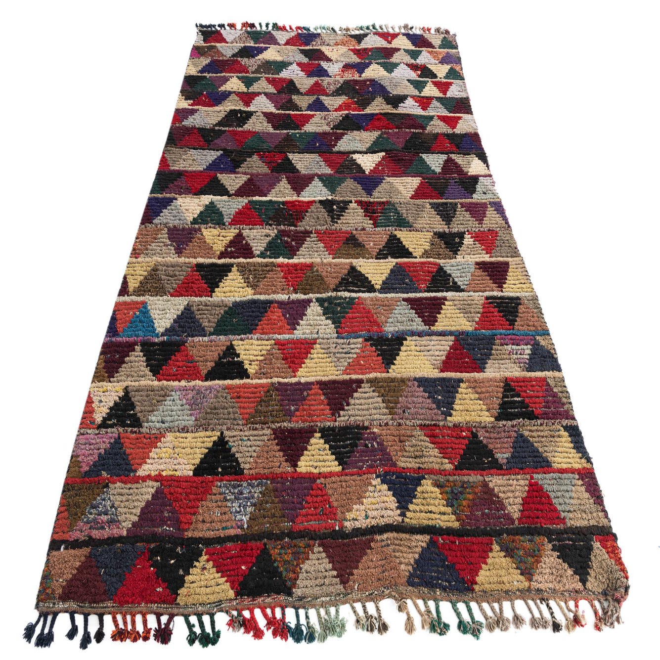 The symmetrical pattern of triangles and diamond shapes creates a dynamic visual rhythm, while the fringed edges add a touch of artisanal charm. The robust wool construction provides a dense, plush feel underfoot, making it a comfortable as well as durable choice for any living space.