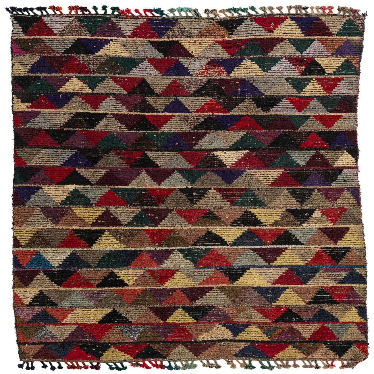 A 6x9 rectangular multi-colored wool shag rug with a vibrant tribal geometric pattern of triangles and tassels.
