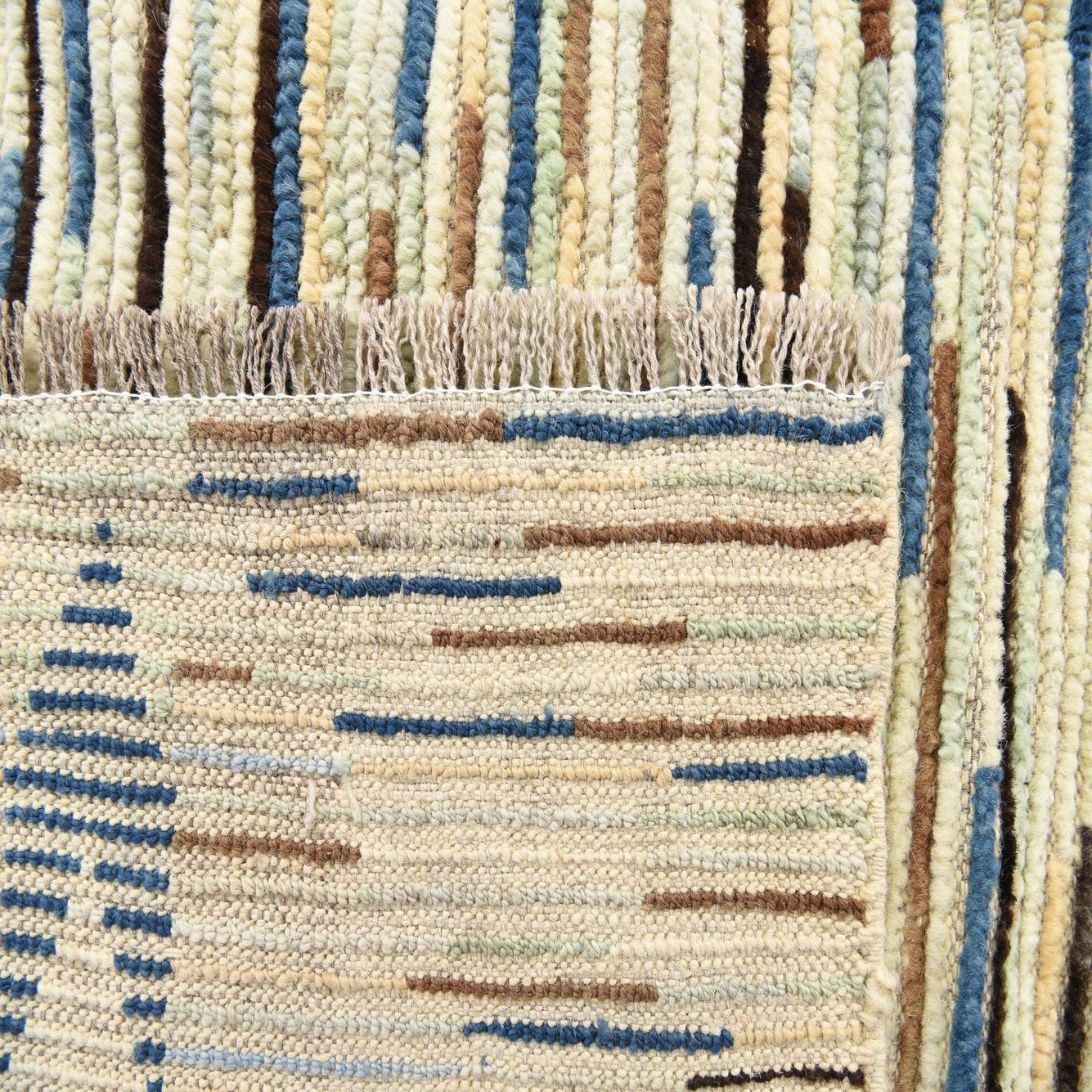 The pattern of this rug is distinctly Moroccan, with an array of multicolored stripes that form a backdrop to symmetrical diamond motifs. The color palette includes a harmonious mix of beige, black, blue, brown, red, yellow, light blue, light brown, and light green on a multicolored background. The intricacy of the design is balanced by the rustic charm of the fringe edges, contributing both character and texture.