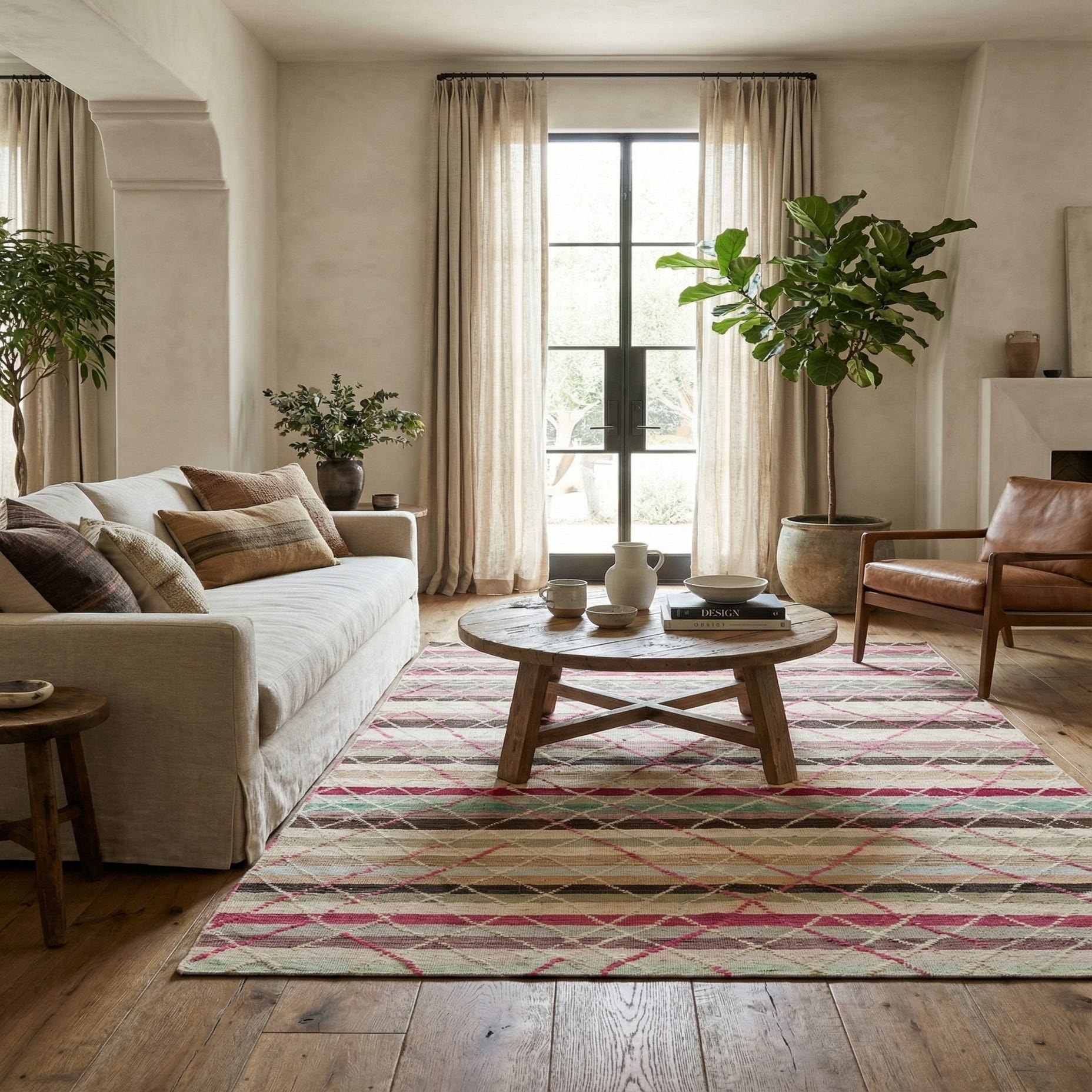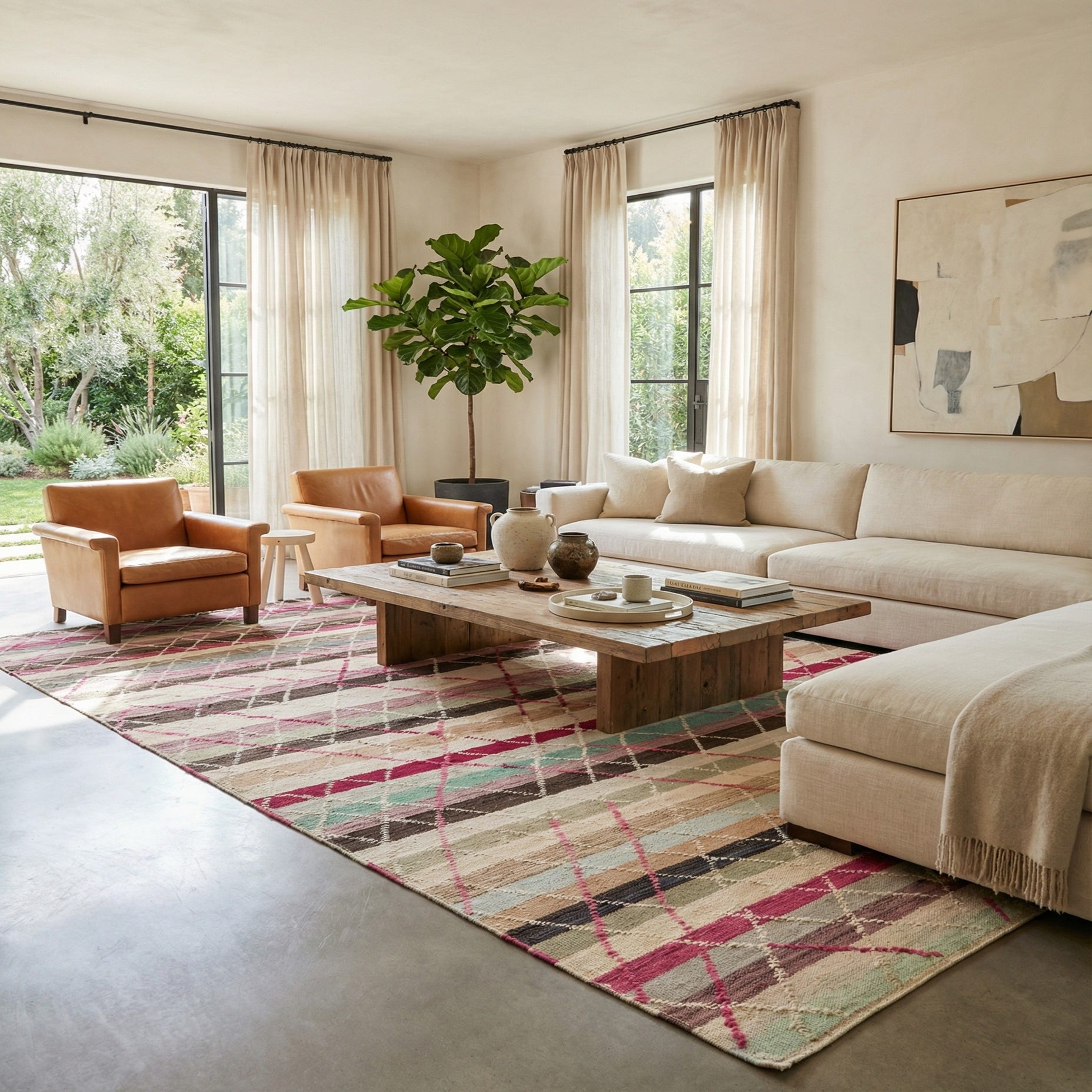 Given the mix of colors and the intricate pattern, this rug is well-suited for spaces that blend modern with bohemian or eclectic styles. It can also serve as an artful addition to minimalist rooms, where it will add warmth and texture without overwhelming the space. Consider placing this rug in a living room, dining area, or bedroom where its craftsmanship and aesthetic can be appreciated fully.