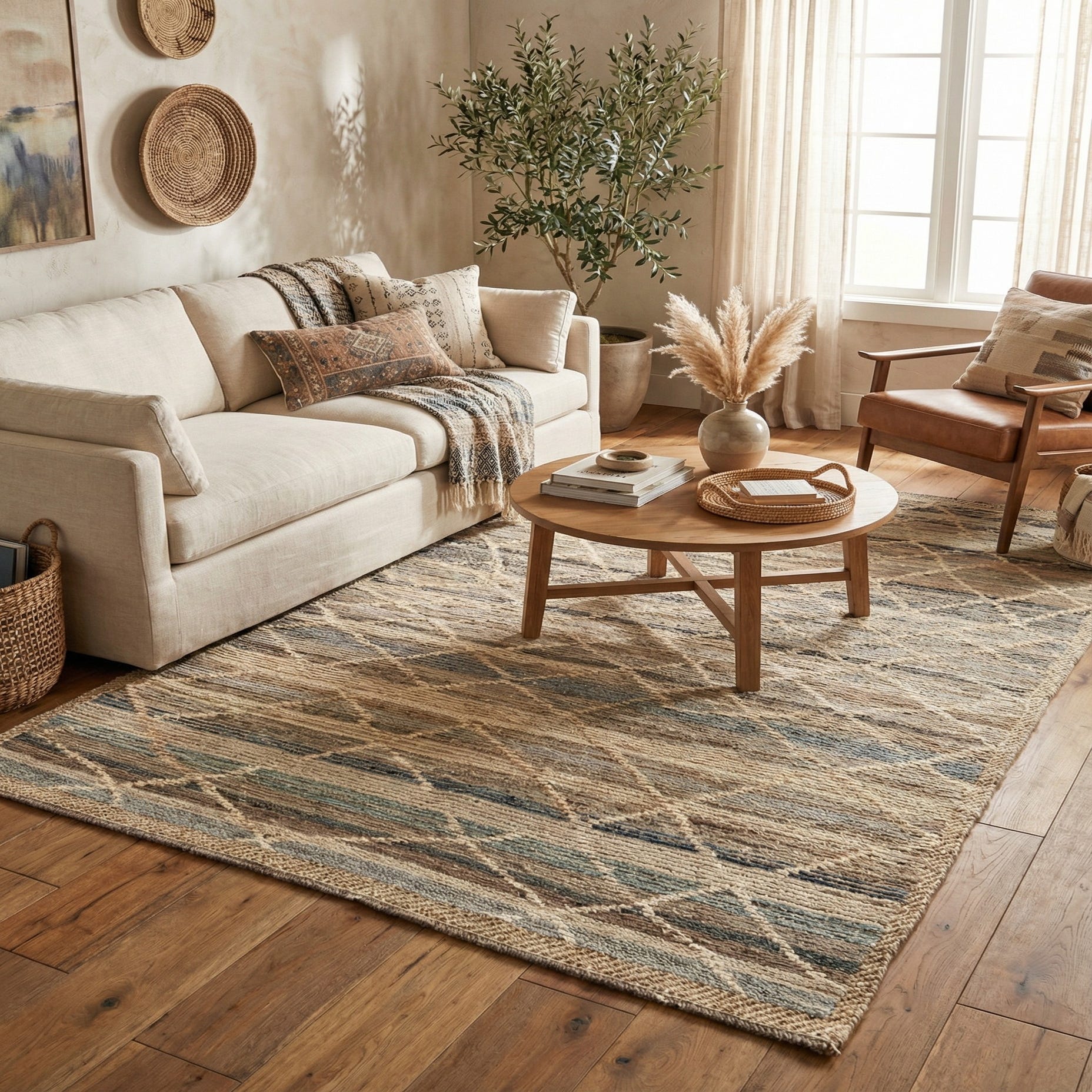 A warm, multi-tonal field of striated color sets the stage for a subtle diamond trellis woven across this hand-knotted 100% wool rug. Bands of beige, light brown and gray are threaded with touches of blue and black, creating a layered, weathered effect that reads both organic and refined. The cream lattice pattern floats gently over the background, giving the rug a geometric structure without feeling rigid.