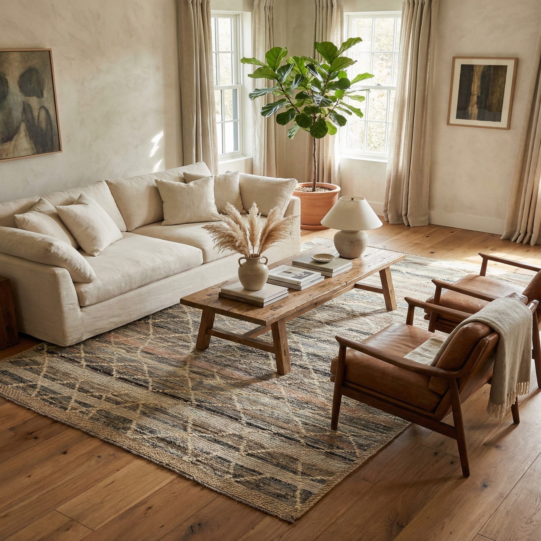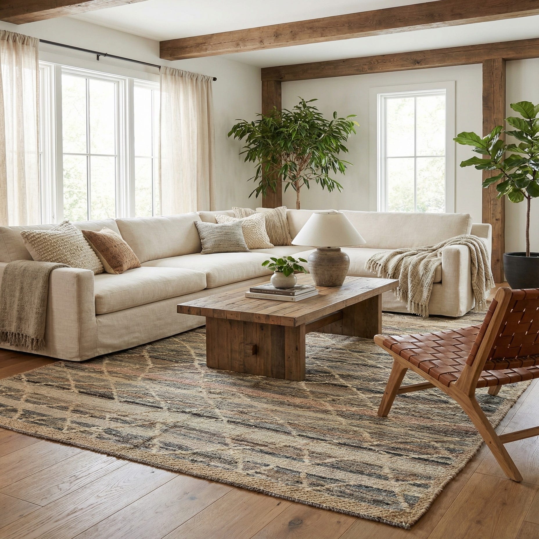 Hand-knotted construction yields a tactile, slightly slubbed surface that feels soft underfoot while retaining a sense of substance and durability. The neutral-driven palette and low-profile texture make it well-suited to casual living rooms or under a seating group to anchor conversation areas. It also works nicely in a bedroom beneath the foot of the bed, a study with wood furnishings, or a coastal or transitional dining room where layered, relaxed textures are desired.