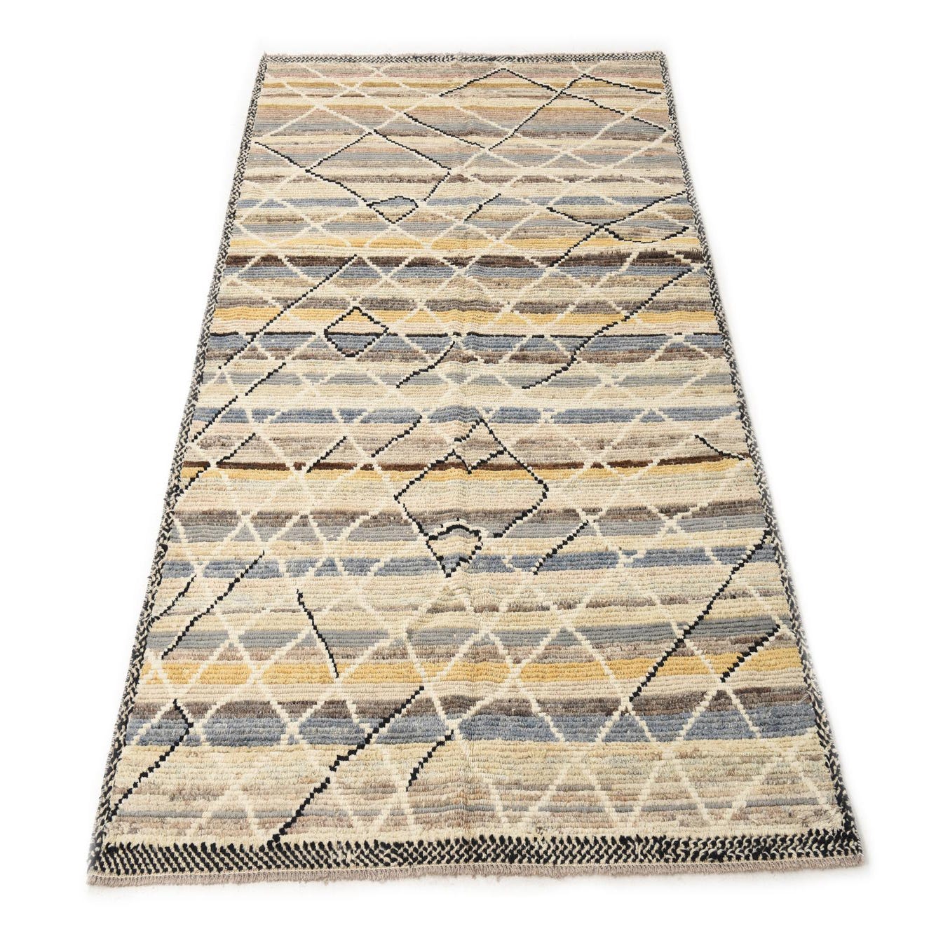 This Moroccan collection rug is a 6x9 hand-knotted piece crafted from 100% wool, promising durability and a luxurious feel underfoot. The rug features a dynamic multi-colored background with accent colors of black, gray, ivory, light blue, light brown, and yellow, creating a vibrant yet nuanced aesthetic. Its visually compelling pattern is a mix of tribal-inspired motifs and geometric shapes outlined in black, lending it an assertive but harmonious appearance.