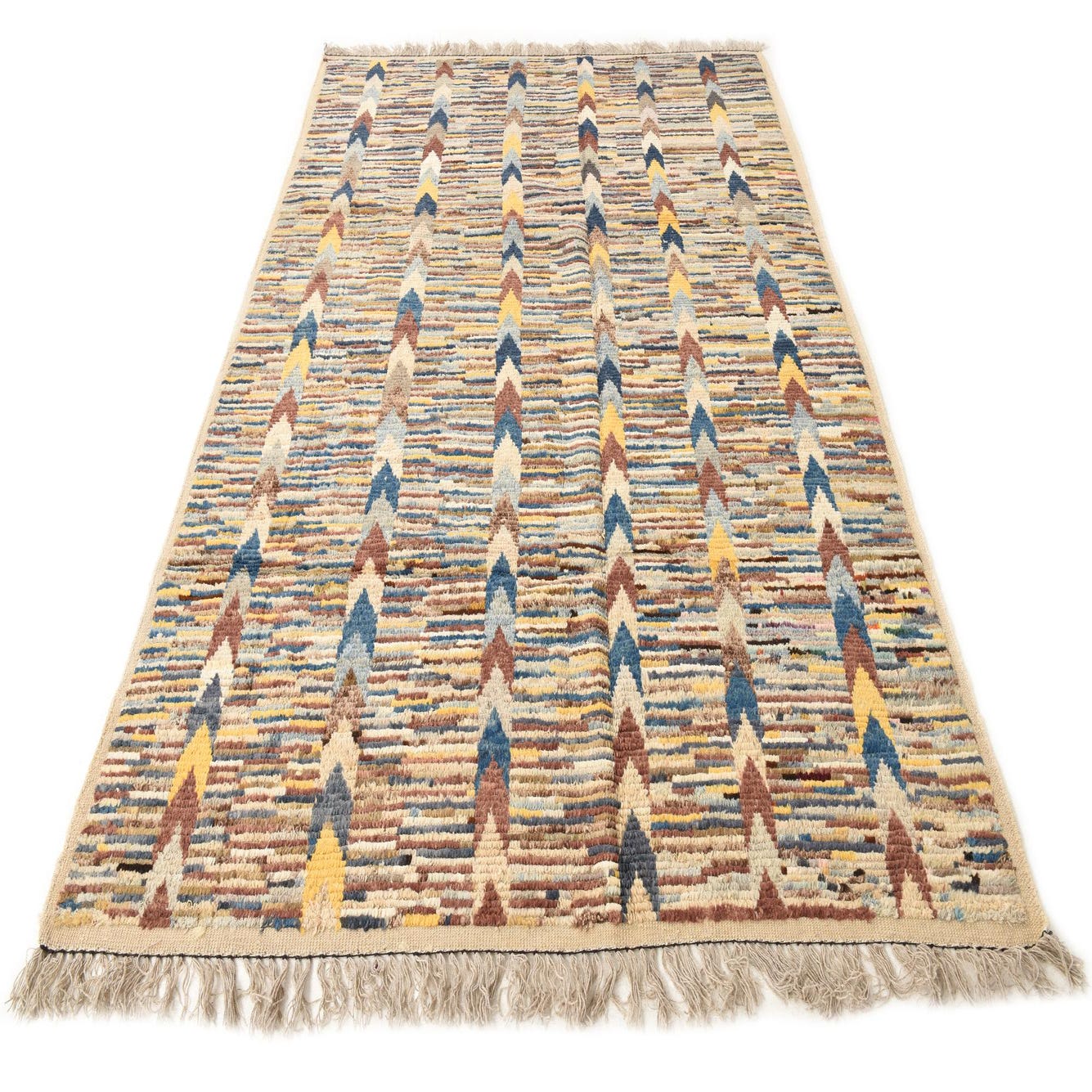 This Moroccan collection rug, with its size of 6x9, presents a vibrant and dynamic aesthetic hand knotted from 100% wool. The pattern features a series of intriguing diamond shapes in an array of colors—beige, black, blue, brown, ivory, light blue, light brown, and yellow—all set against a multi-colored background that provides a tapestry of visual interest. The texture is rendered with a substantial yet soft wool pile, offering both comfort and durability, while the fringe detail on the ends adds an authentic and tactile finish.