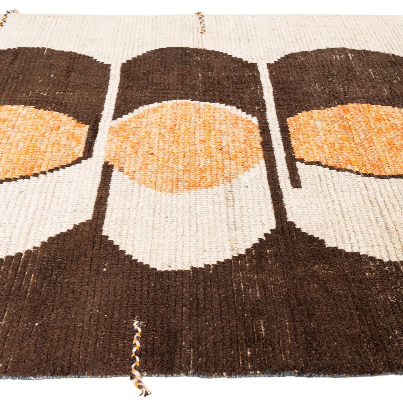 A 6x9 rectangular shag rug featuring a modern tribal pattern in dark brown, cream, and orange abstract shapes.