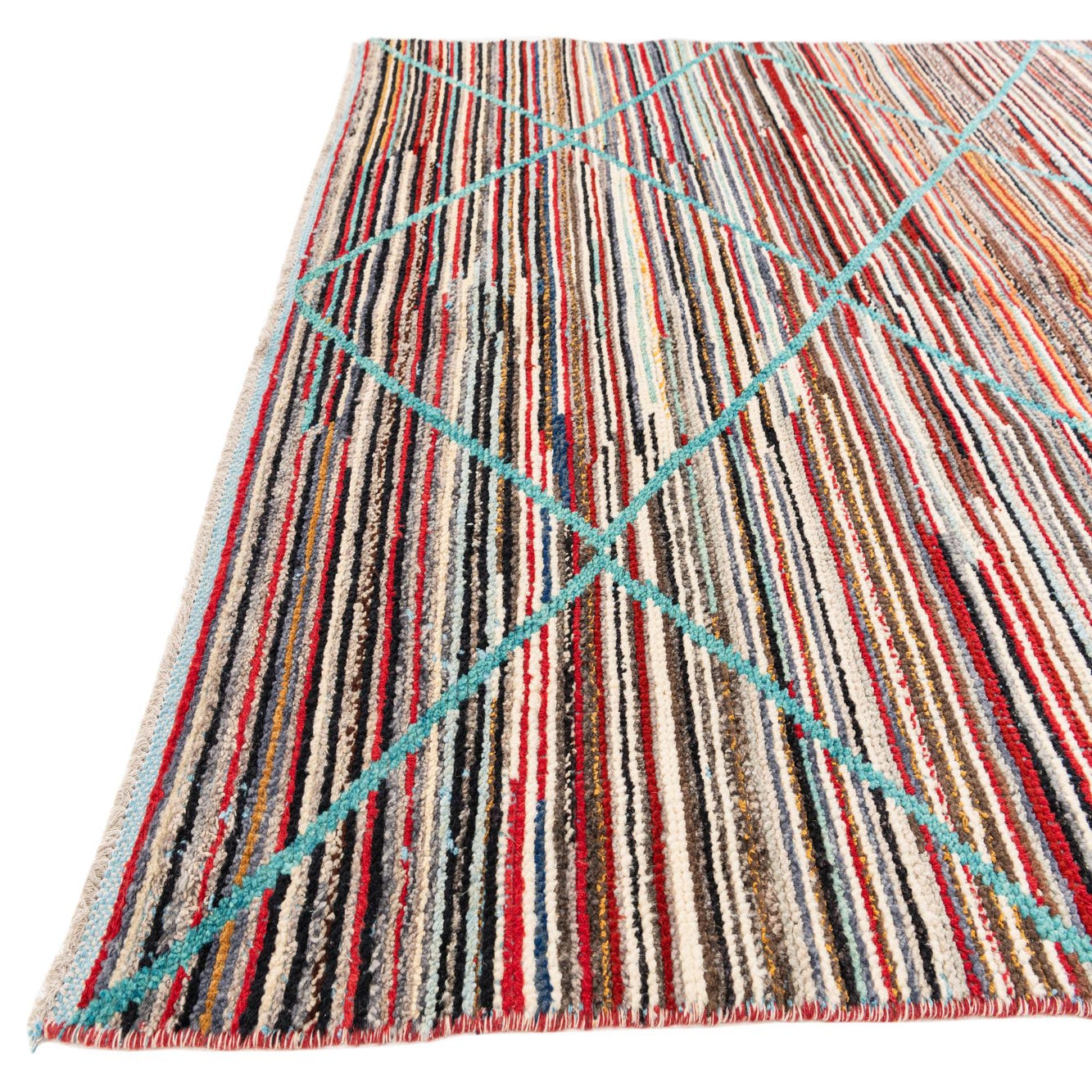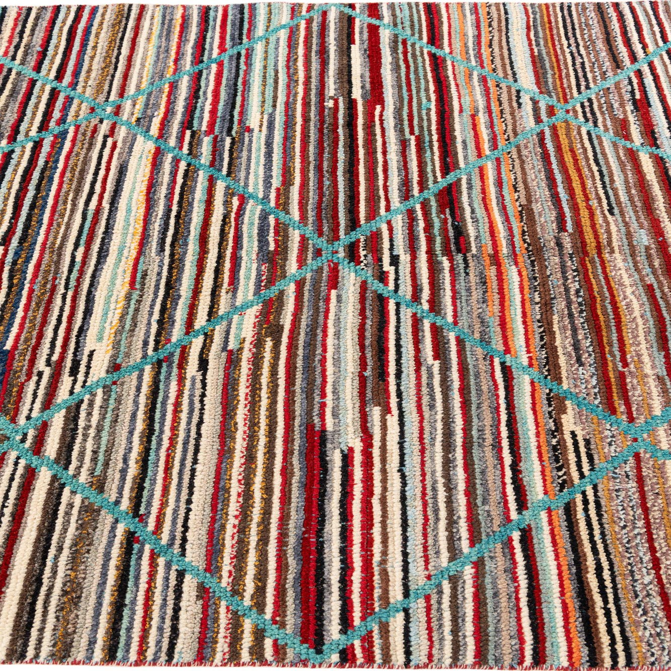 A 6x9 multi-colored rectangular shag rug featuring horizontal stripes and a prominent turquoise diamond pattern, ideal for a living room.