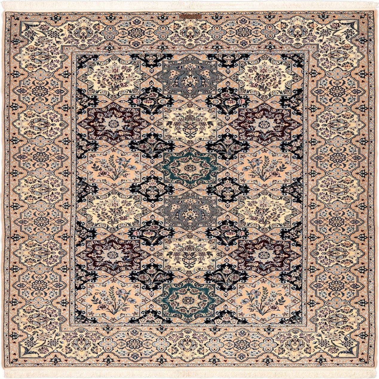 A 6x9 rectangular multi-colored wool and silk rug with a complex traditional floral and medallion pattern.