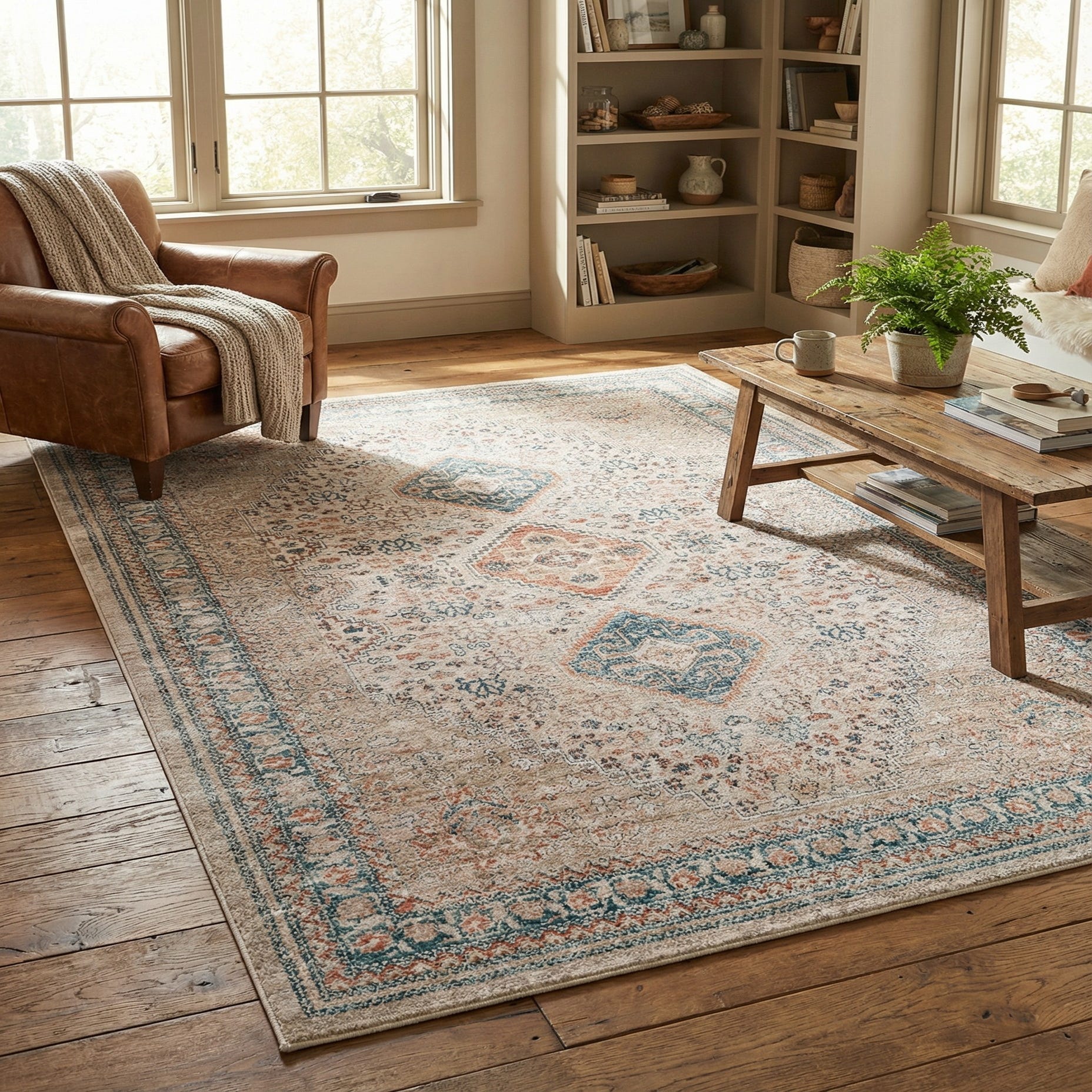 Machine-made of 100% polypropylene, the rug has a low pile and a tight, even weave that lies flat and feels smooth underfoot. Its balanced colorway and traditional-meets-casual pattern work well in a range of interiors — place it beneath a coffee table to anchor a living room seating group, layer it in a bedroom for added warmth, or set it under a dining table to unite mixed wood and metal furniture. It pairs naturally with neutral upholstery, warm wood tones, and accent pieces in terracotta or blue to pick up the rug’s color highlights.