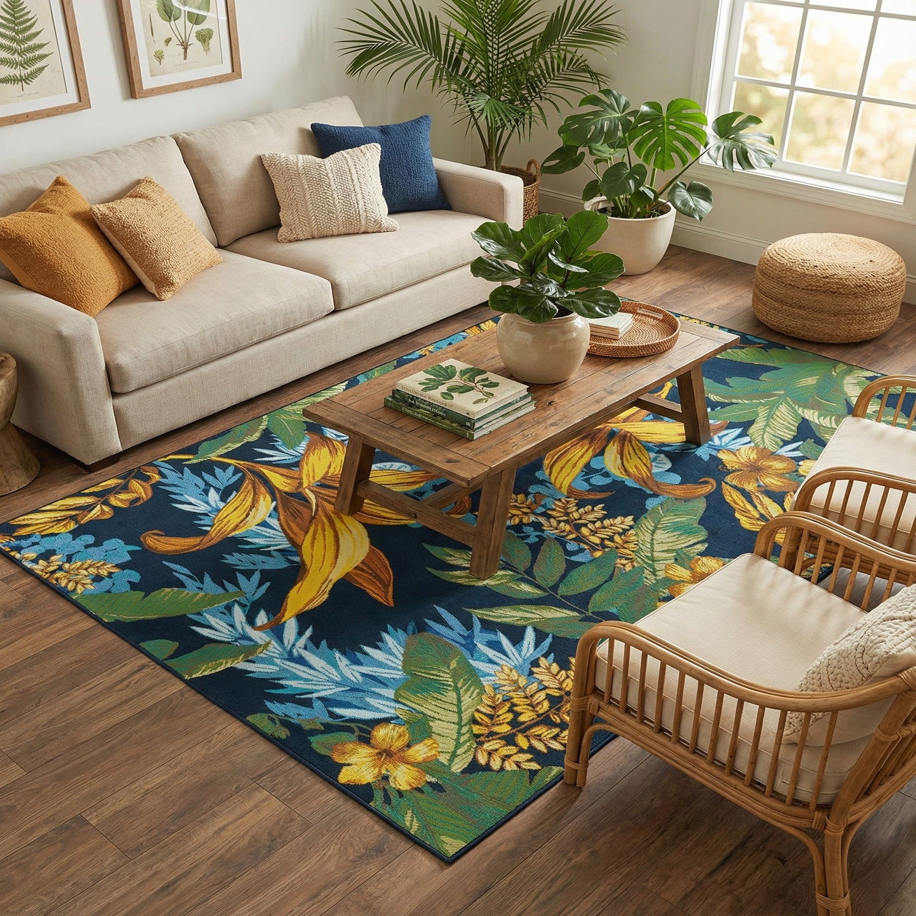 Machine-made from 75% polypropylene and 25% polyester, the rug has a low-profile, tightly woven surface that feels smooth and slightly dense underfoot, with enough structure to hold the printed detail crisply. It works well outdoors or in transitional indoor spaces: place it beneath a patio dining set, beneath a small seating group on a covered porch, or layer it in a sunroom to tie together woven furniture, teak finishes and navy or neutral textiles. Also effective as a focal point in a casual living room or entry where bold color and botanical energy are desired.