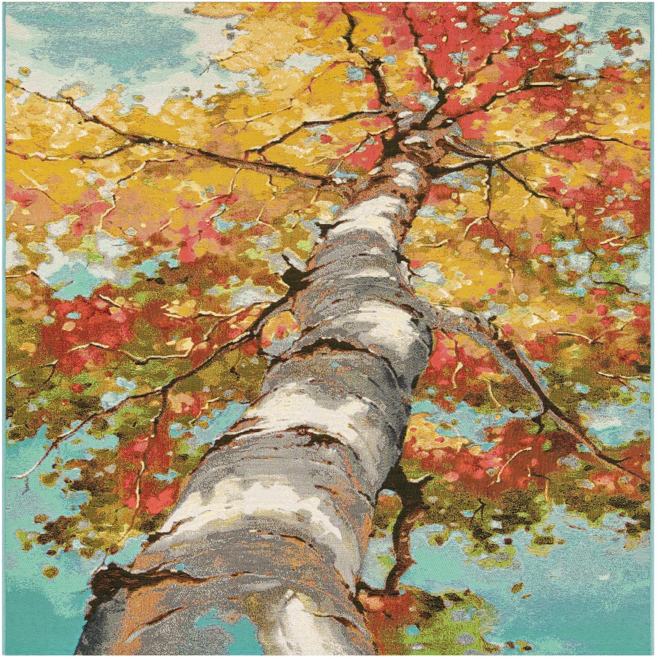 A vibrant 6x9 rectangular rug featuring a modern, multi-colored birch tree design with autumn leaves against a blue sky, suitable for indoor or outdoor use.