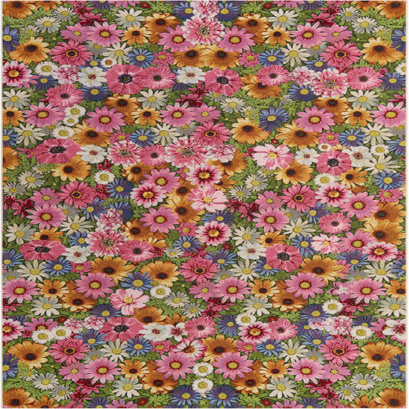 A vibrant 6x9 rectangular rug featuring a dense, multi-colored floral pattern with pink, orange, blue, and white flowers on a green background.