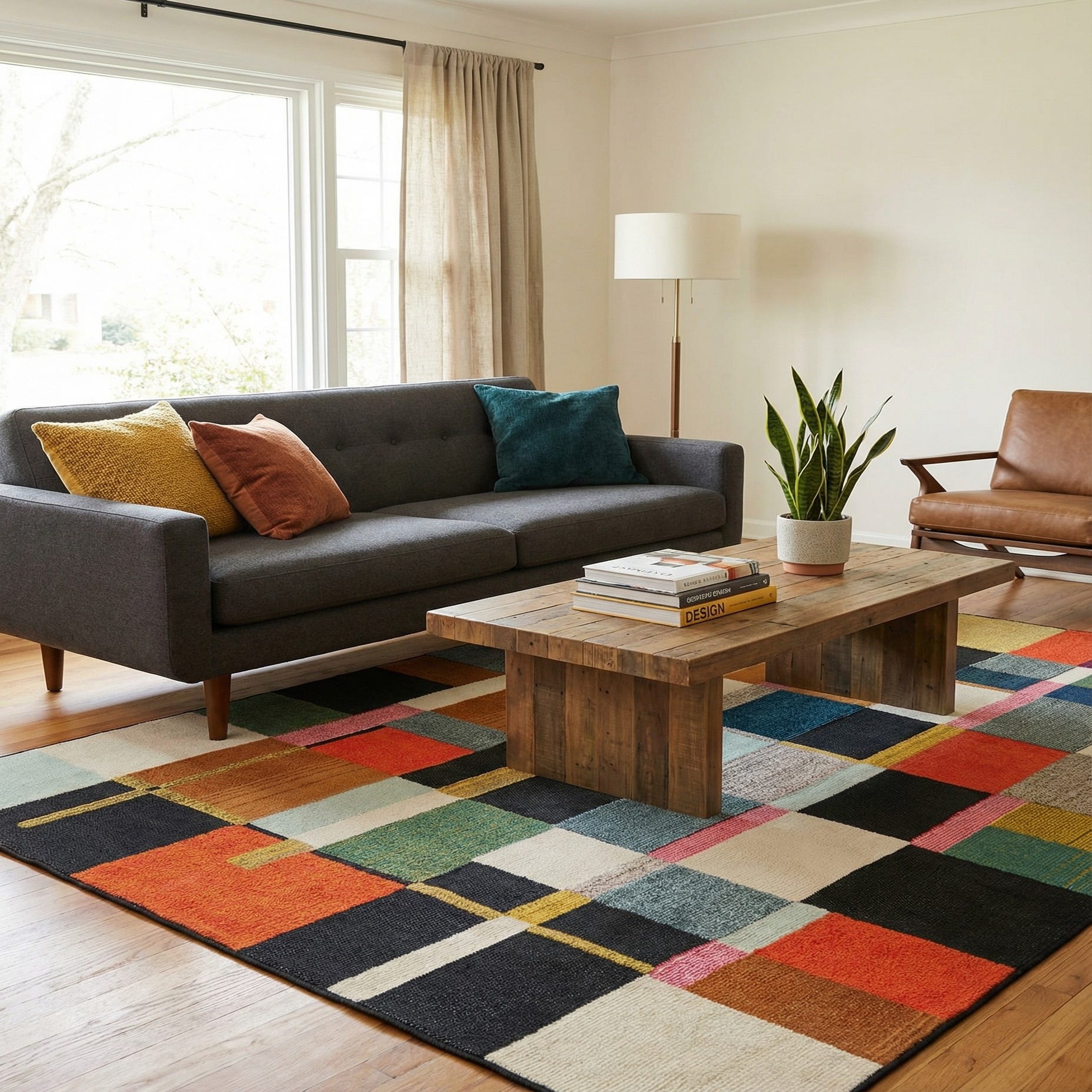 A 6x9 rectangular multi-colored modern rug with a patchwork design, featuring blocks of black, orange, yellow, pink, blue, and green.