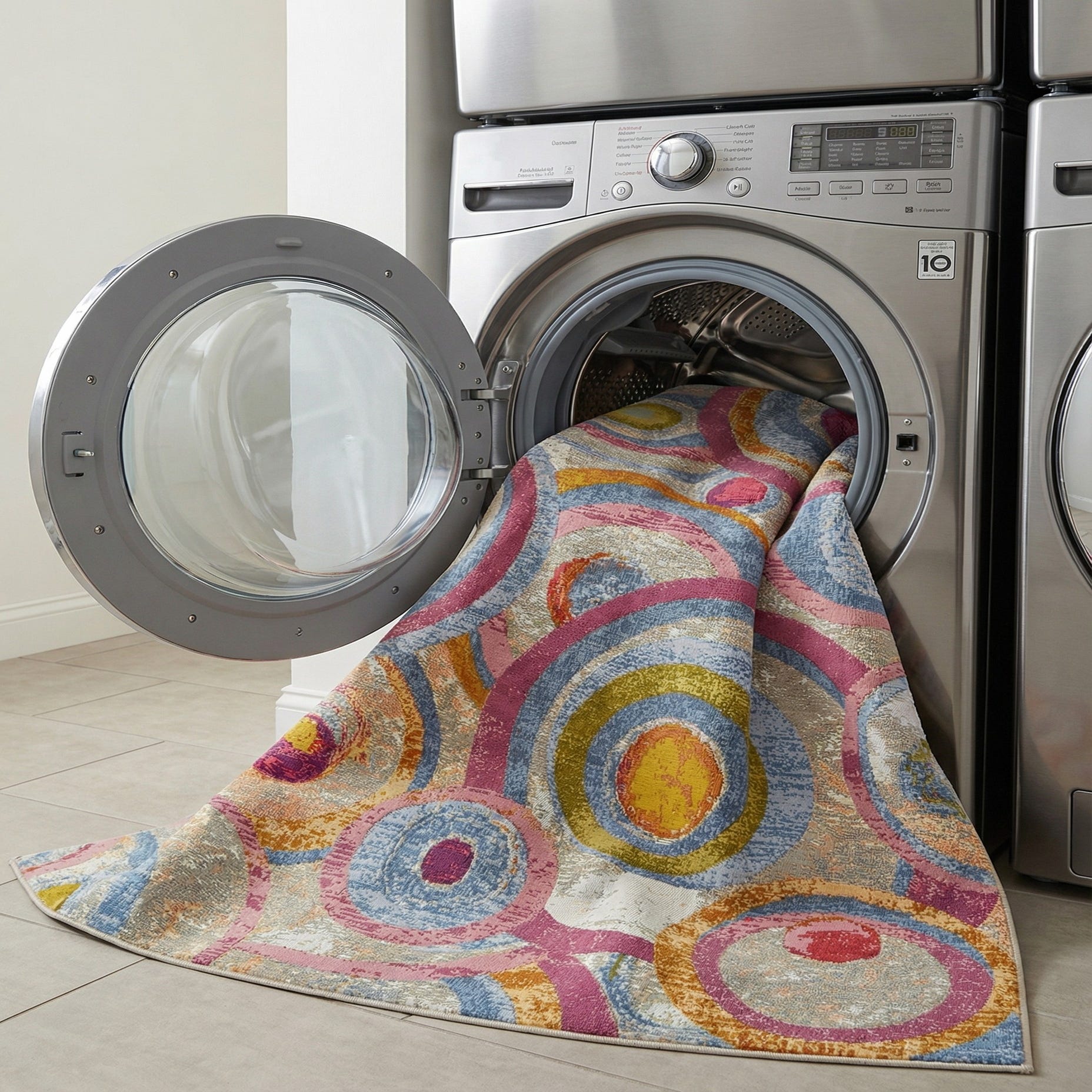 A 6x9 multi-colored rectangular rug featuring a modern abstract pattern of overlapping circles in various sizes and vibrant hues like blue, pink, orange, and green on a light background.