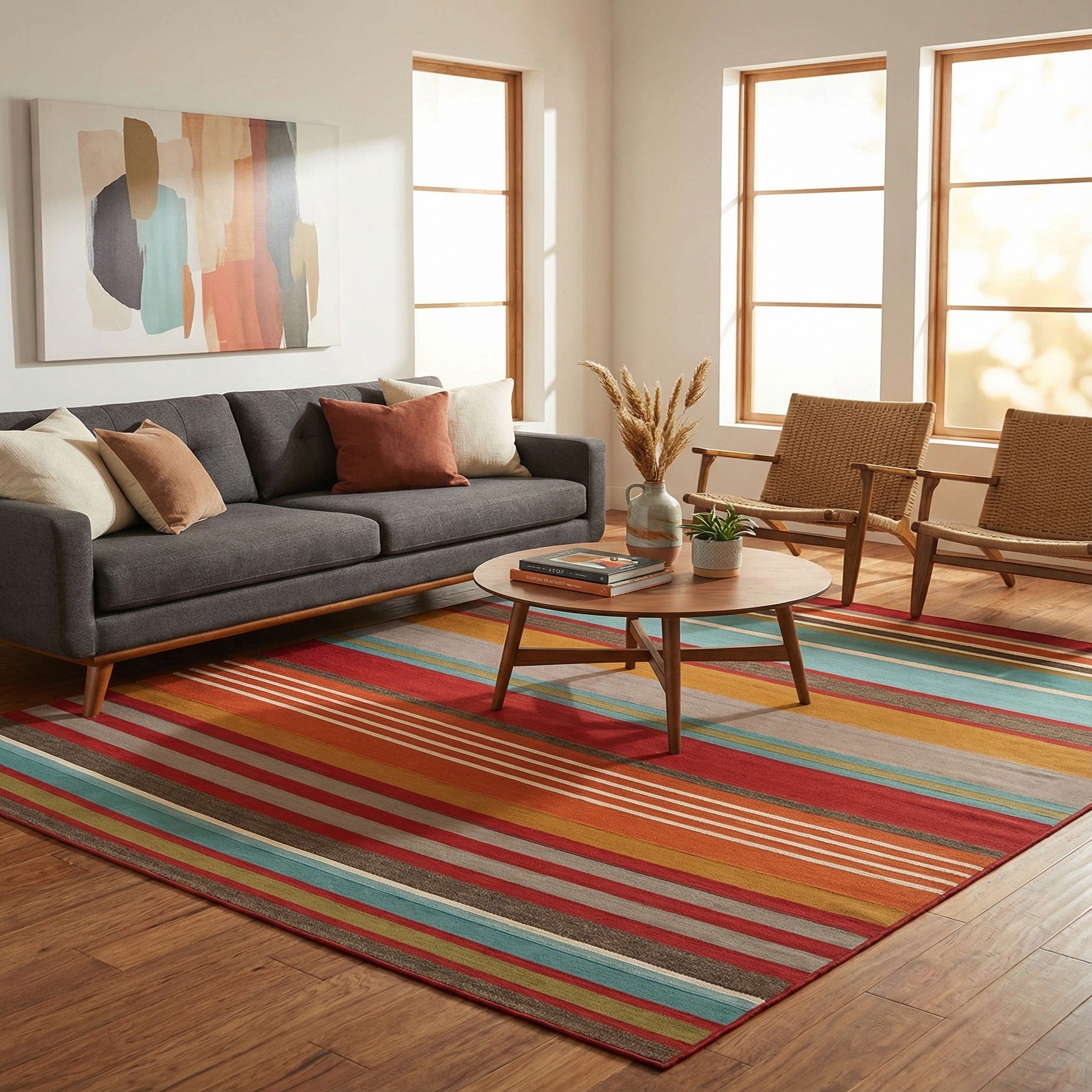 This rug brings color and structure to both indoor and outdoor settings. It pairs well with natural wood or wicker furniture for a relaxed patio or sunroom, complements mid-century and contemporary seating in a living room, and can sit confidently beneath a dining table to introduce warmth and pattern. Use it to anchor an outdoor lounge area, add visual interest to a covered porch, or inject layered color in an eclectic, modern interior.