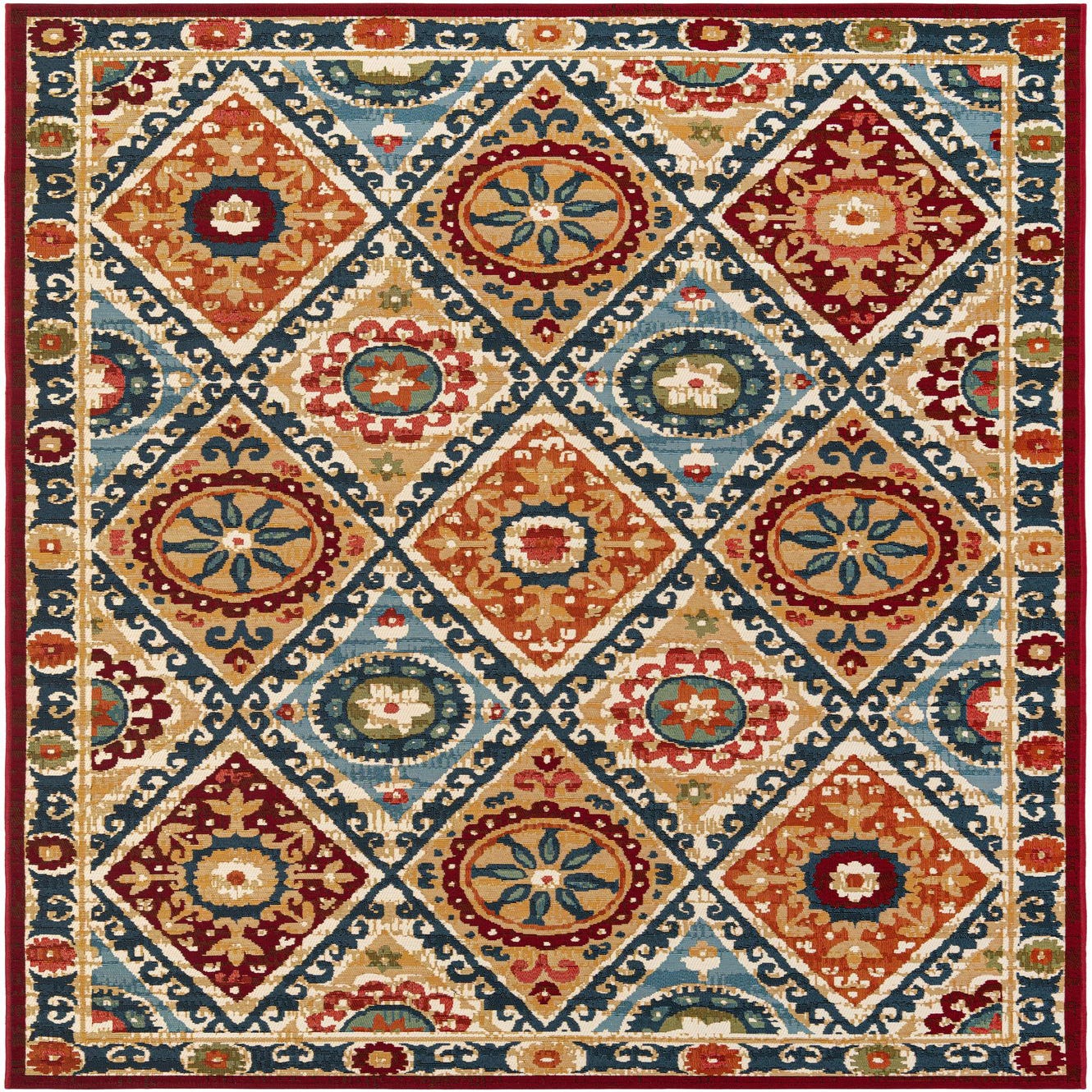 A lively geometric medallion pattern runs across a multicolored field, alternating diamond and round motifs framed by a scrolling border. Rich tones of navy and light blue anchor the design while warm rust, olive, yellow, red, brown and ivory add depth and contrast. The motifs have a slightly distressed, hand-woven appearance that brings traditional and global influences together in a modern layout. Machine-made from 100% polypropylene, the surface has a low, dense pile with a firm, even weave that feels smooth underfoot and holds the pattern definition clearly.