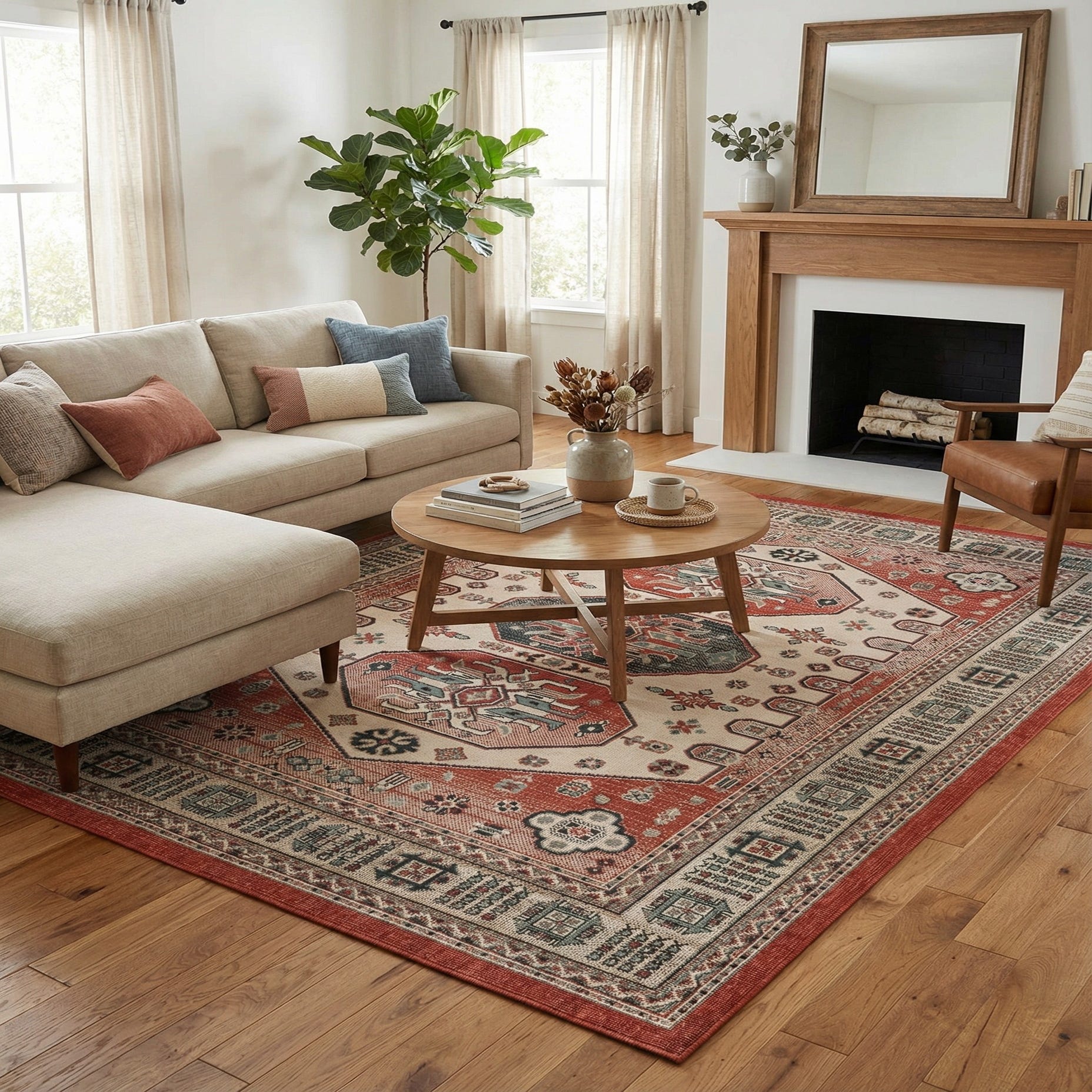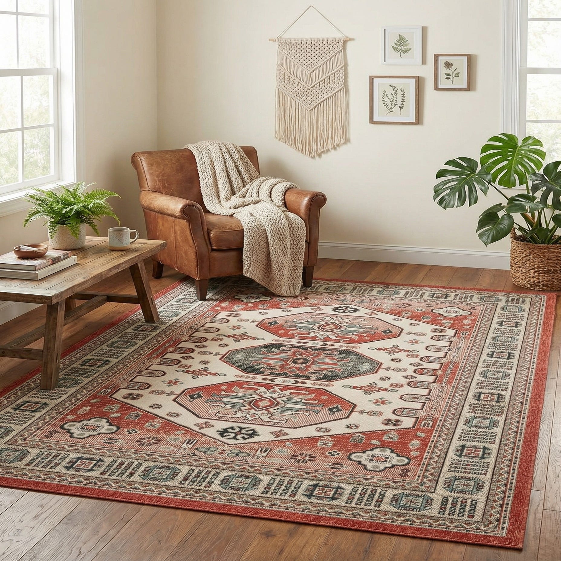 Machine made of 100% polypropylene, the rug has a low-profile, tightly woven surface that feels firm underfoot with a subtle texture from the weave. That construction makes it a good fit for covered patios, porches, sunrooms, or an indoor dining area—pair it with warm wood furniture, wicker or metal patio pieces, or neutral linen upholstery to emphasize the rug’s traditional character. It also complements farmhouse, transitional, and Mediterranean-inspired interiors where layered pattern and warm color are welcome.