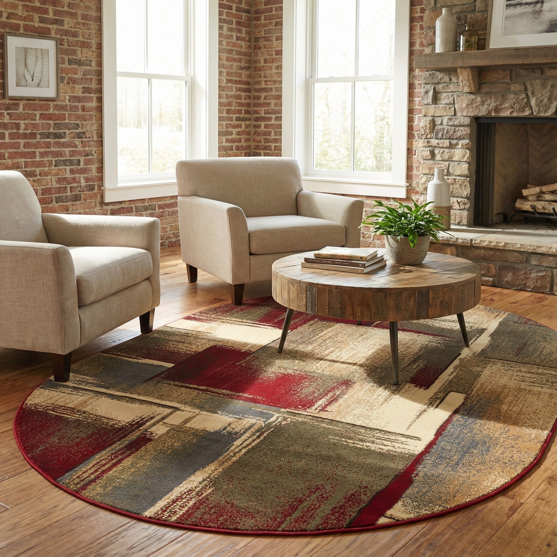 An oval multi-colored rug with an abstract pattern in shades of red, gold, beige, and gray, featuring brushstroke-like blocks.