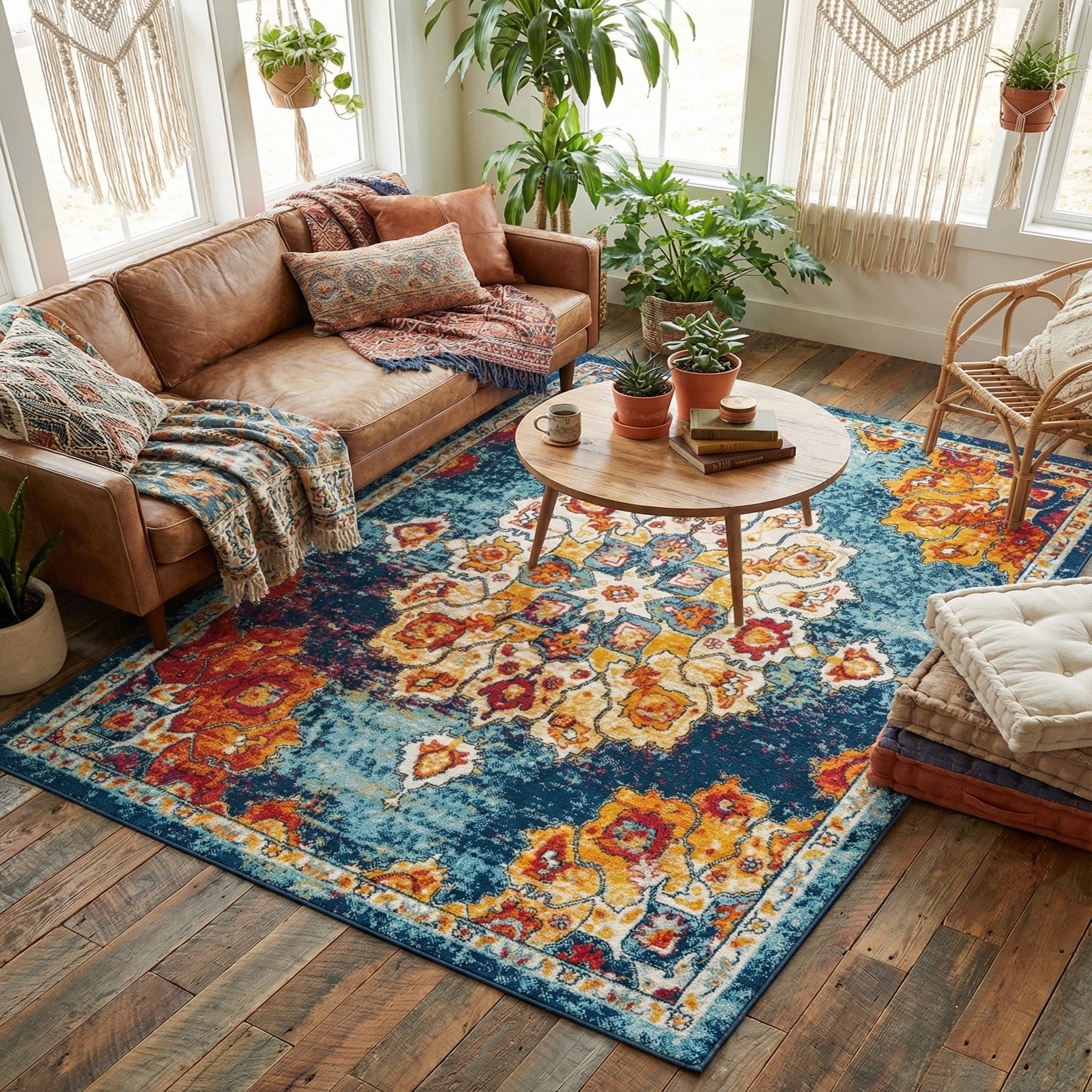Place this rug under a seating group to anchor a living room with layered textiles and natural wood furniture, or use it to bring color and pattern into a neutral home office. It also complements eclectic and bohemian interiors where mixed patterns and bright accents are welcome, and it can warm a dining area when paired with simple, modern tableware. The colorway works well with navy and cream upholstery, as well as warm-toned woods and metallic accents.